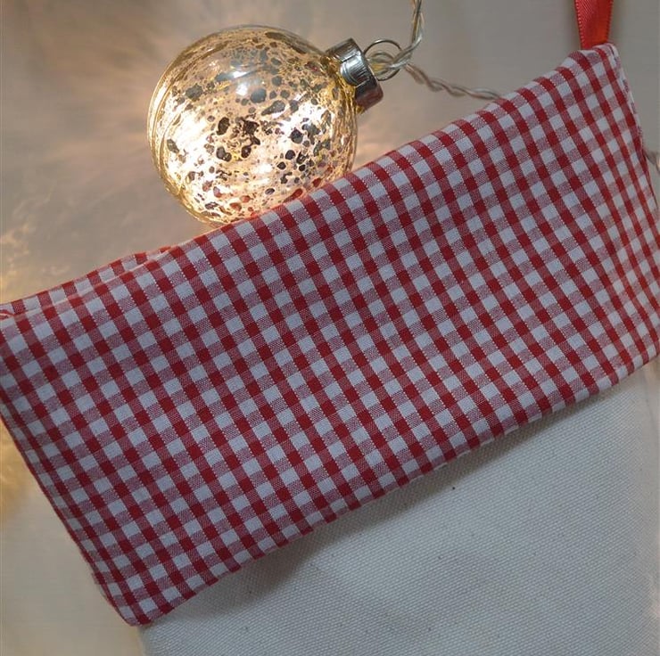 This beautiful Christmas Stocking is made from a Cotton Canvas fabric making it strong enough to be filled with gifts. It is fully lined with a Calico fabric with cotton Gingham cuff and a red ribbon loop for hanging.