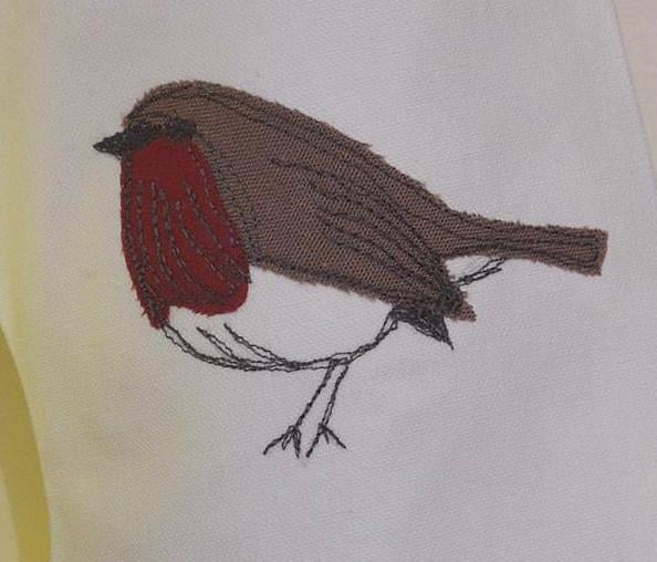 The traditional cheery Robin design featuring on the front is made using the Freehand Machine Embroidery technique which involves “drawing” in thread, using the needle as your pencil, on a basic sewing machine. The resulting picture is therefore unique.