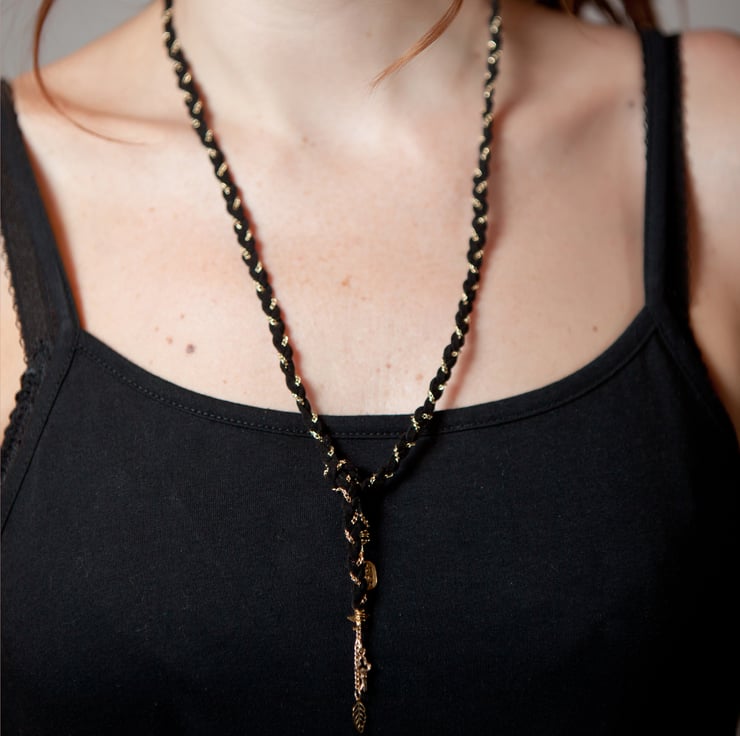 It has no clasp so it can be worn in any position, anywhere on the body, tied simply with a knot.