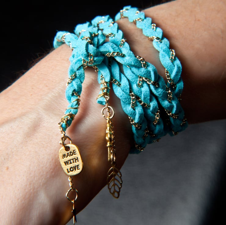 It is made from mock suede plaited with fine chain and finished at the ends with four gold charms including a leaf, key and 'made with love' pebble.