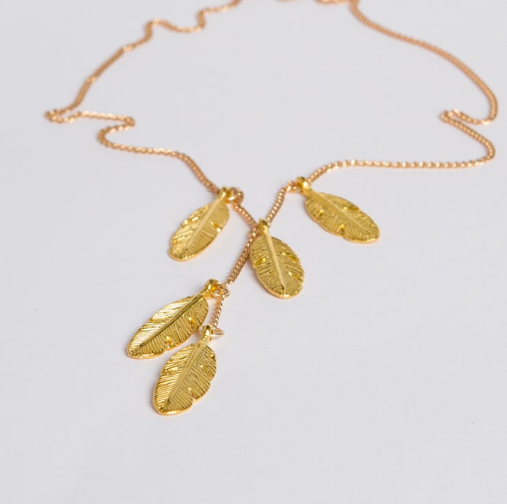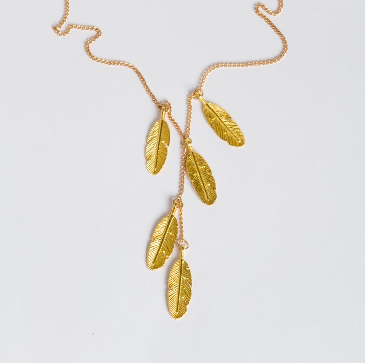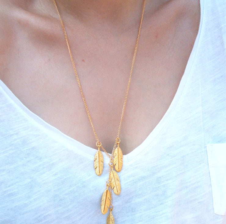 5 native American style feather charms hang at low chest level around a long gold chain with a centre chain drop creating a Y shape.