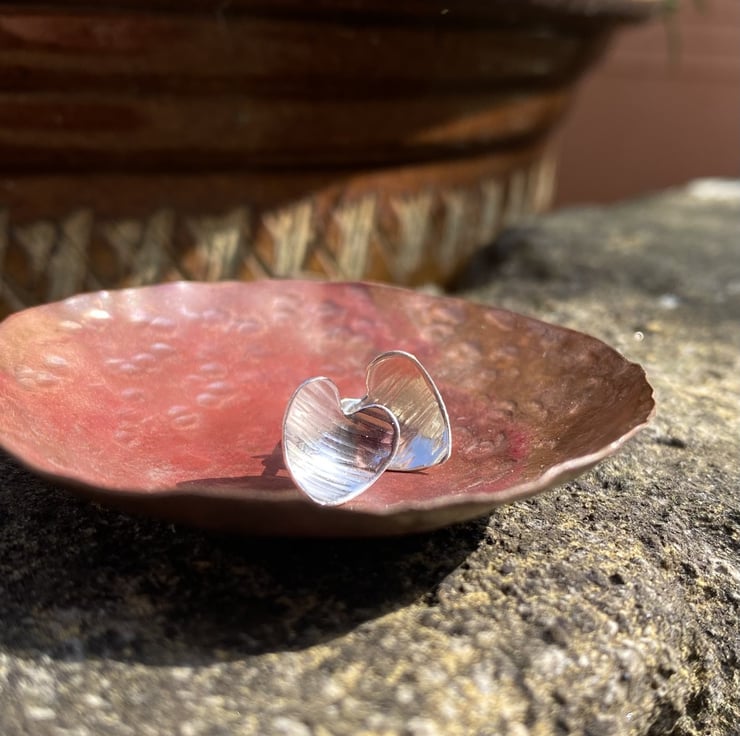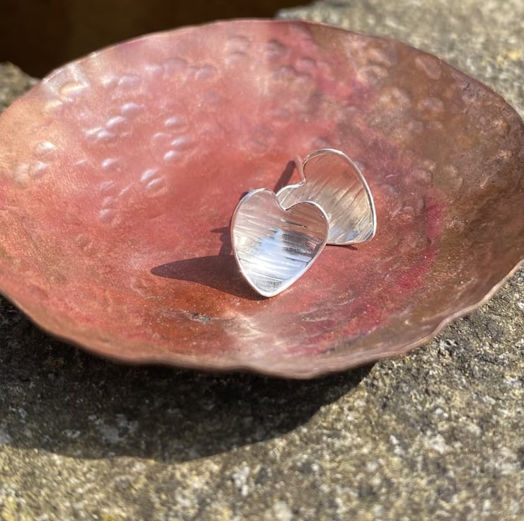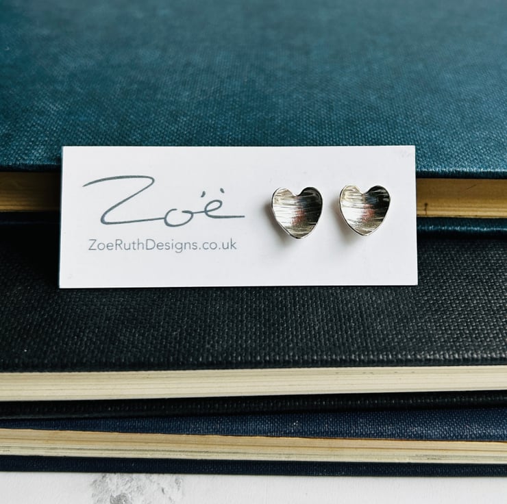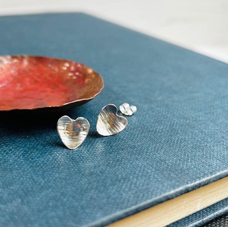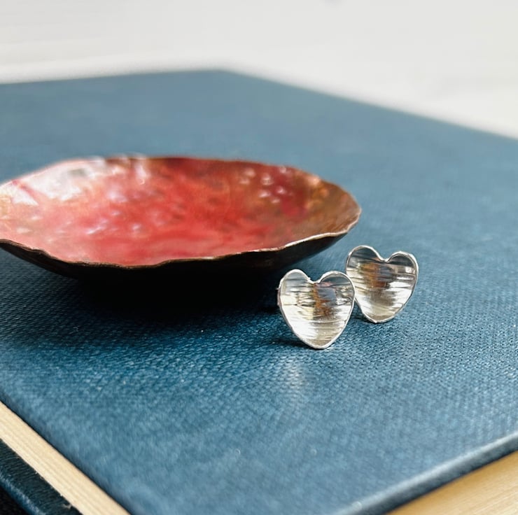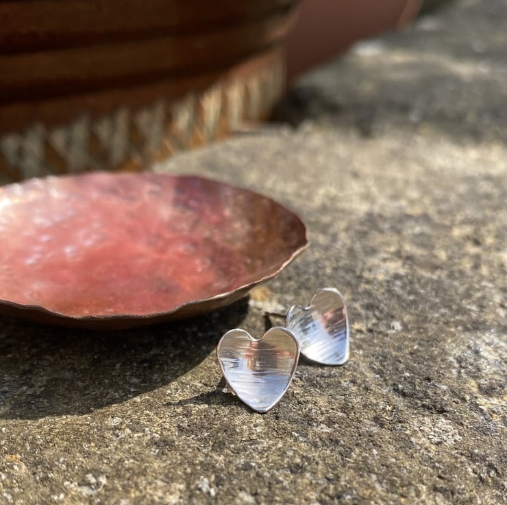 I cut the heart shape from a sterling silver sheet and then hammer the surface to create a textured linear pattern. The studs have a beautiful slight concave shape which allows the light to bounce off of them.