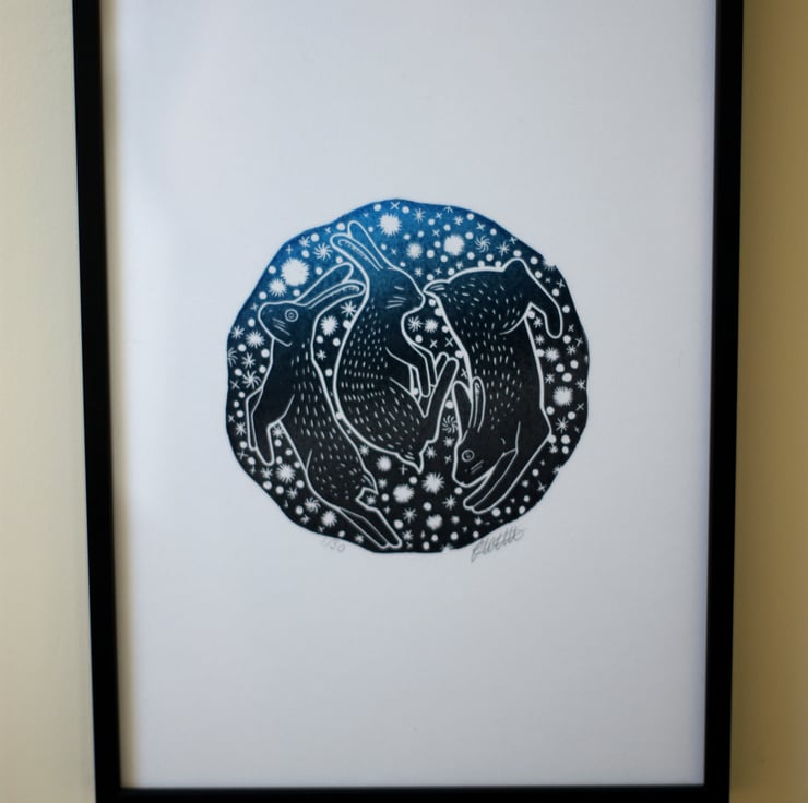 I use UK made heavyweight, acid free A4 paper, the design is roughly 12cm x 12cm, individually signed and numbered in pencil.
