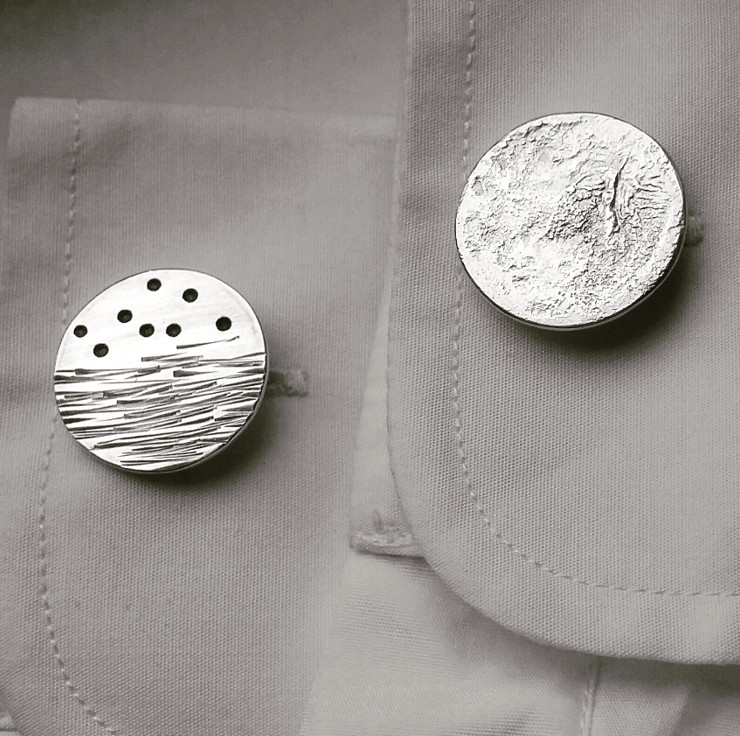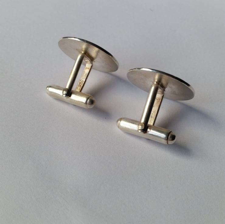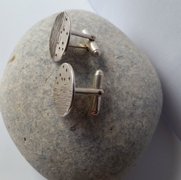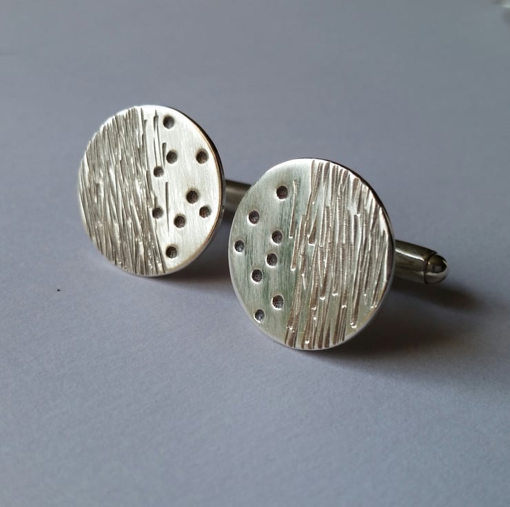 These are a pair of very contemporary sterling silver handmade cufflinks. They have a minimal design with textures and dots which can be worn everyday or for special occasions and weddings. The cufflinks have a smooth satin finish which catches the light and shows the markings..