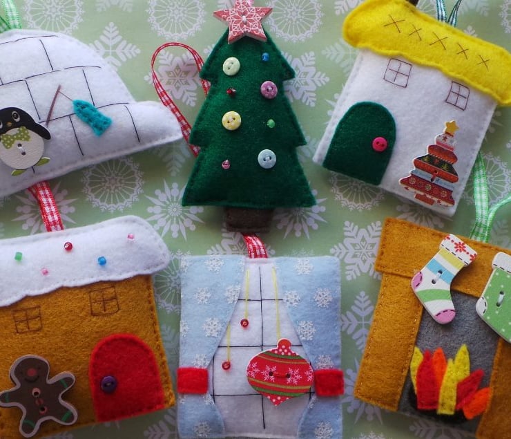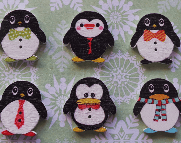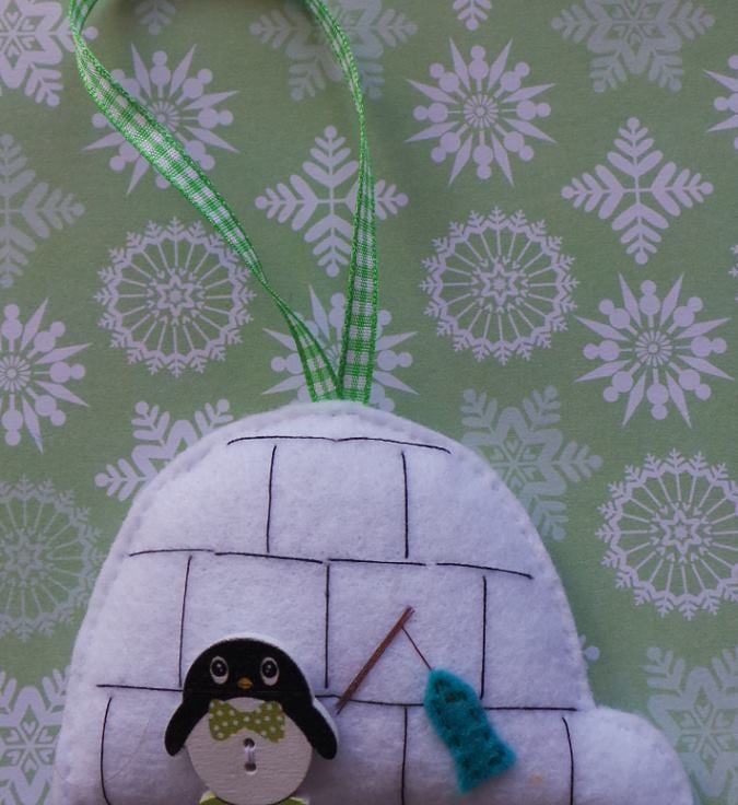 White felt igloo with a penguin wooden button who is holding a little rod with a felt fish on the end