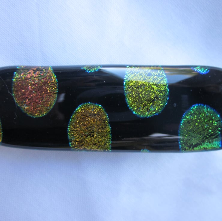 These cabochons have pretty dichroic spots on a black background. The colours are a lovely blend of brilliant oranges, yellows and greens with a hint of turquoise. They are fitted with silver metal crocodile clips. These are approximately 7.5cm long so larger than my usual clips. They might also be used as a brooch or to fix a scarf.
