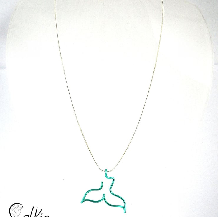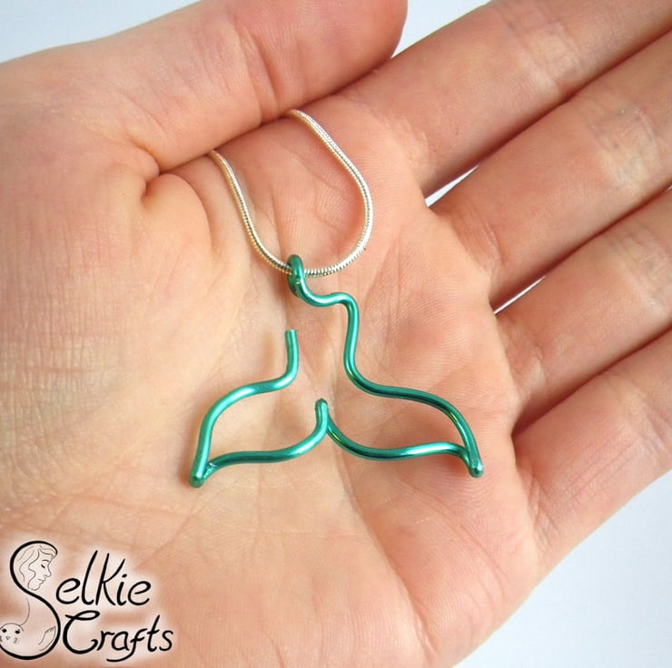 Made with sea green wire hand shaped into a whale tail outline. The pendant comes on an 18” snake chain.