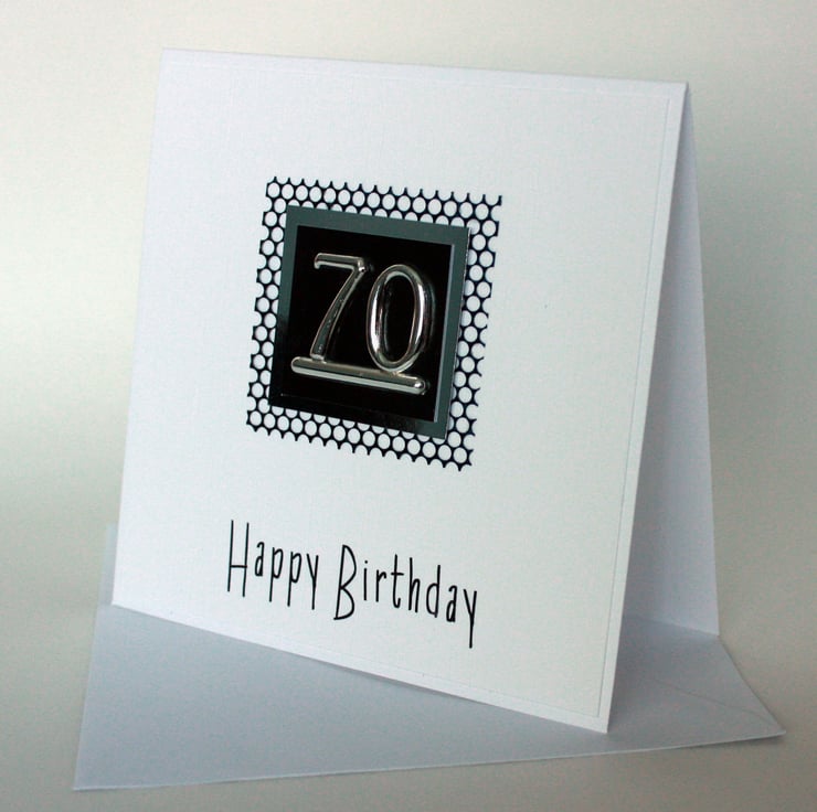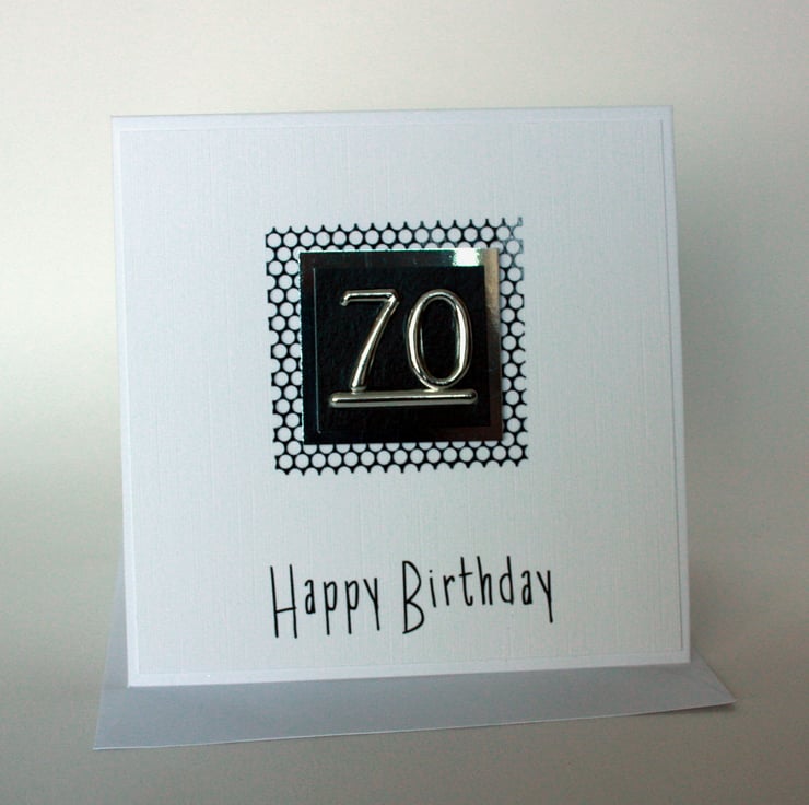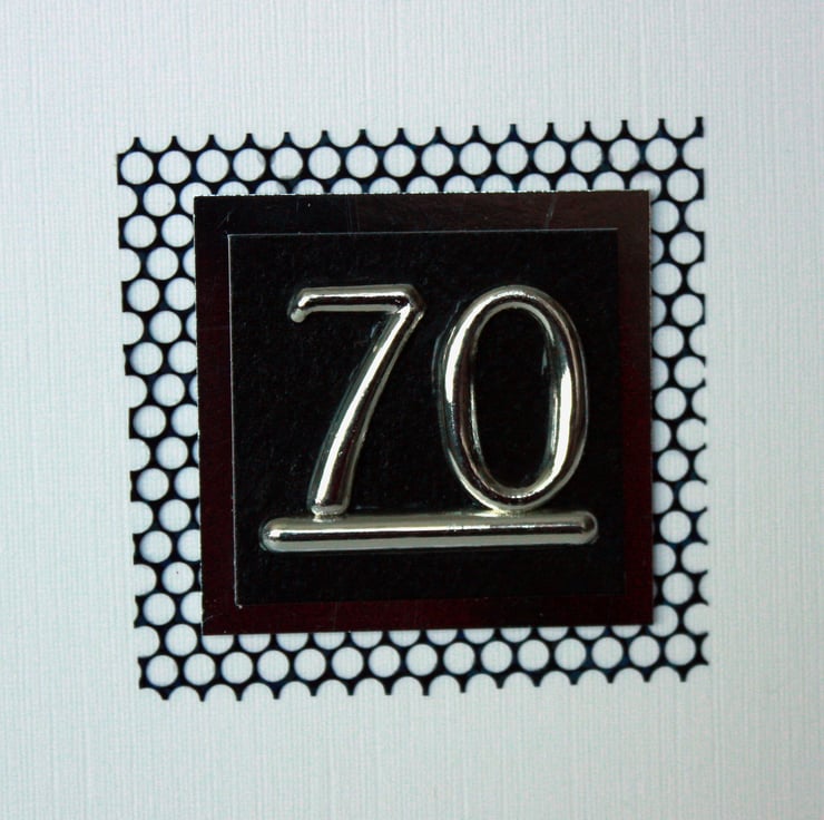 Square 70th birthday card featuring a silver coloured '70' topper layered onto black pearlescent card, silver mirri card and black foil mesh. A simple design, particularly suitable for distinguished gentlemen of a certain age! The card measures approx 5" (12.5cm) square and the insert has been left blank for your own message.