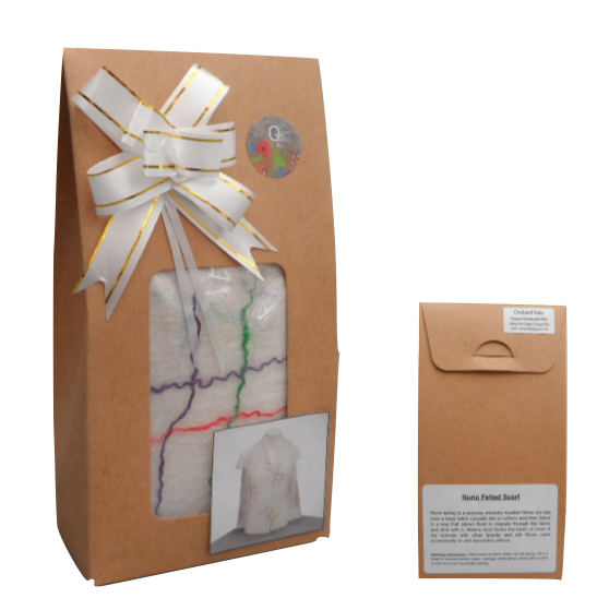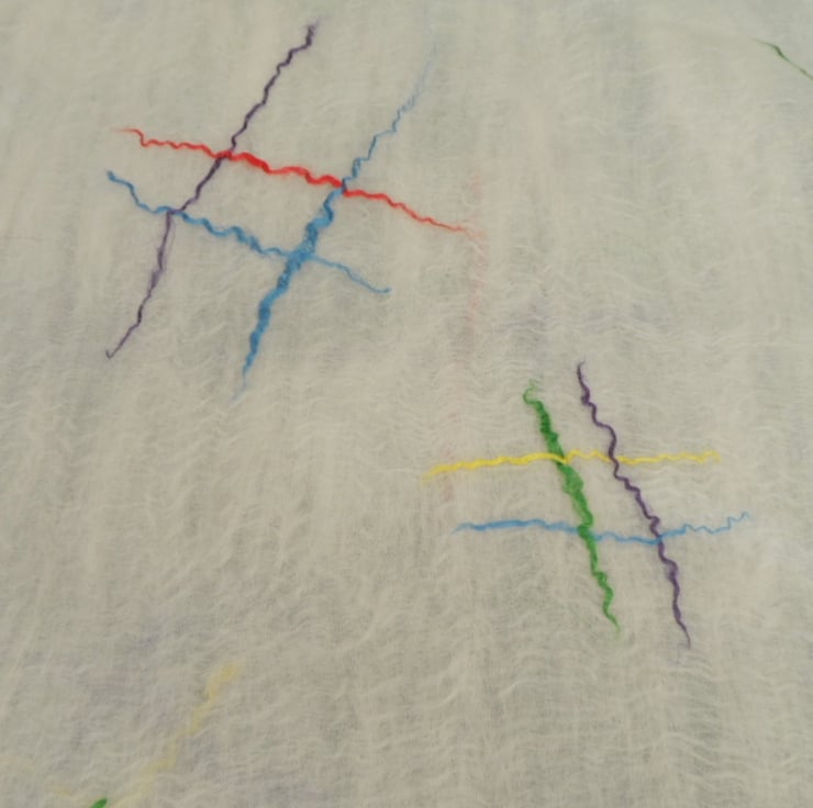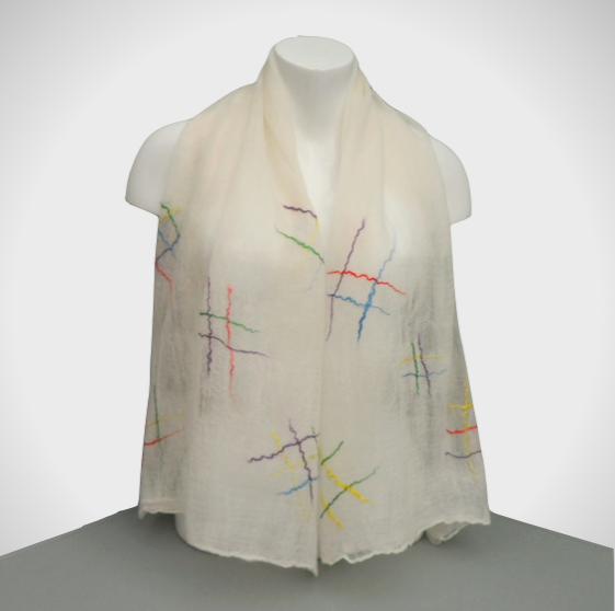 This beautifully lightweight scarf has been made using an extremely fine layer of cream coloured merino wool over a cream silk chiffon base. Brightly coloured silk fibres have been laid over the surface in a random cross hatch pattern and the whole scarf has then been nuno felted.