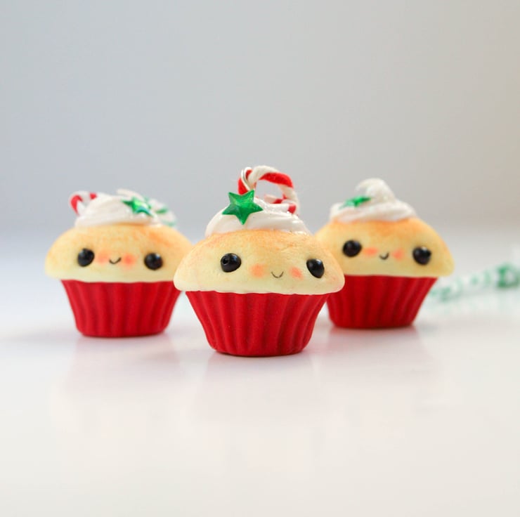 Each little cup cake is created using soft fimo that is textured and tinted with pastel chalks and finished with a good lashing a icing and adorned with festive candy canes, holly or stars!