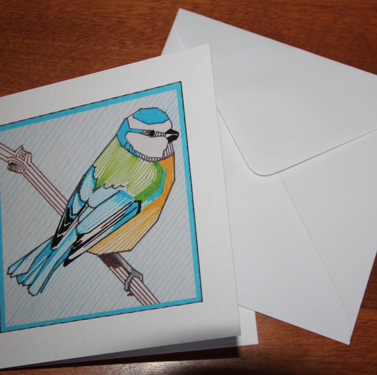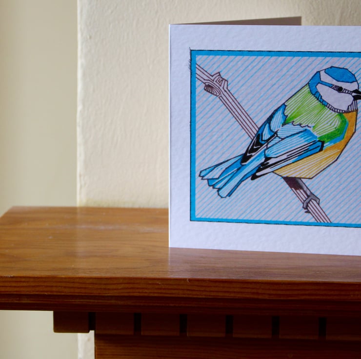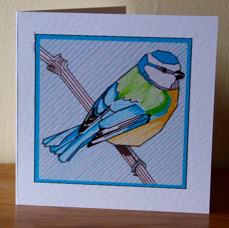 This is a card printed from an original geometric ink drawing of a Blue Tit.