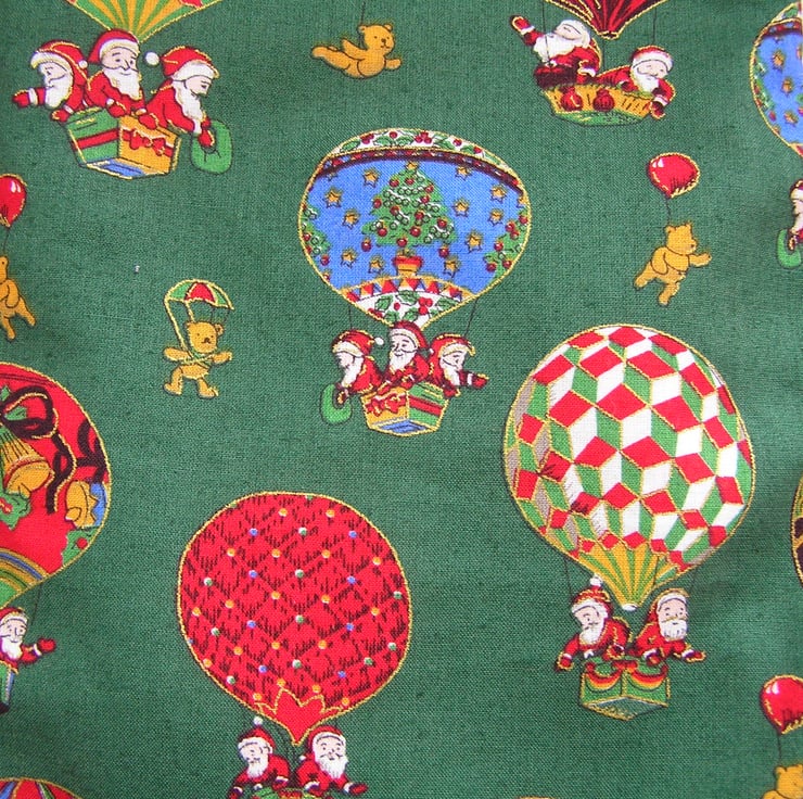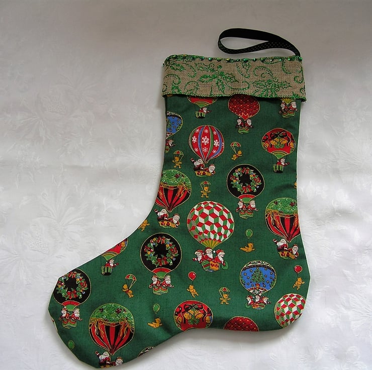 Green fabric Christmas stocking, santa in his hot air balloon and teddy patterned fabric. Has a hessian top with a glittery holly leaf pattern which is sewn on using shiny green sequins. Fully lined with a white cotton fabric and has a green hanging ribbon.