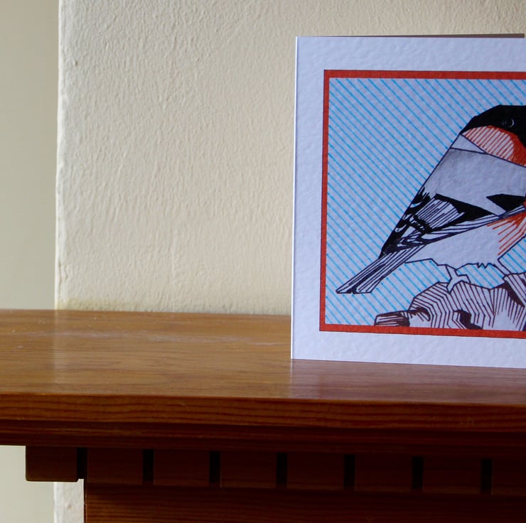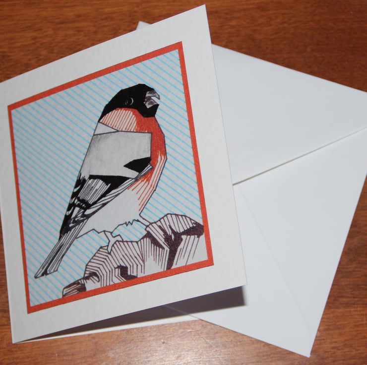 This is a card printed from an original geometric ink drawing of a Bull finch.