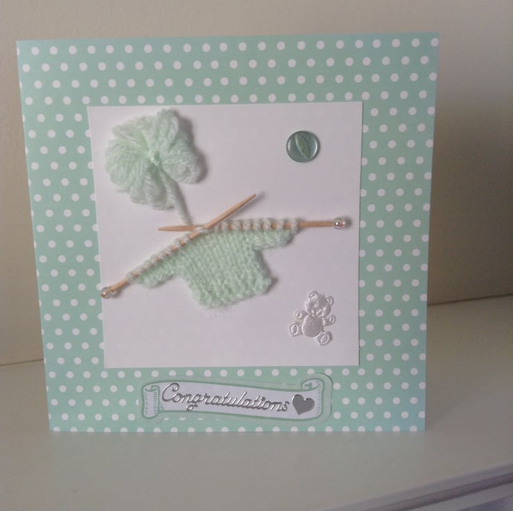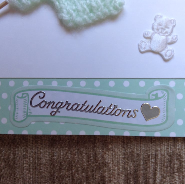 Finally finished with an embellishment which reads 'Congratulations' a mint green button and white fabric teddy bear.