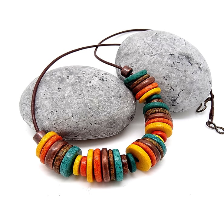 This is a lovely necklace made entirely with ceramic disc beads. The discs measure 13mm and 8mm, the colours are mustard, burnt orange,teal green,tan,and mottled brown. There are also a smattering of antique bronze coloured discs. The beads hang from brown greek leather cord and the necklace closes with a antique bronze coloured hook clasp. The necklace measures 48cm (19"). As all of the items in my shop are unique, individual pieces made by myself, this is the necklace you will receive, it will arrive gift wrapped in tissue paper and a organza bag.