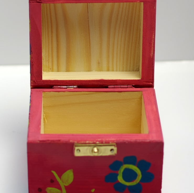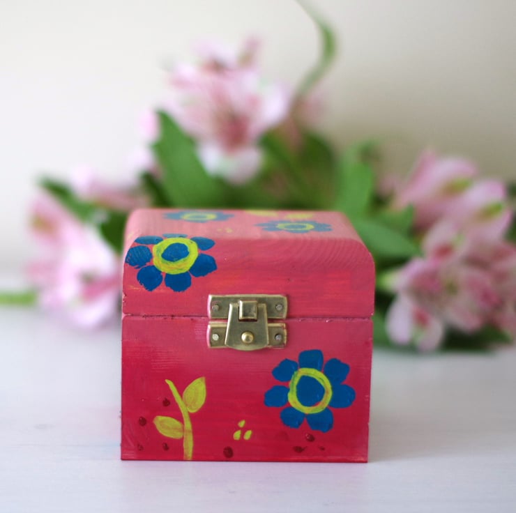 This small wooden box is hand painted by me using acrylic paints in dusty pink and hints of red for the background and turquoise and green for the flowers and leaves. It is perfect as a jewellery box or decorative box in your home, as well as a tea box. The floral box is varnished for protection with two layers and it is natural wood inside. It is perfect as a gift for girls of all ages. It measures 3.8" x 3" x 3.8high.
