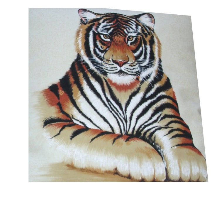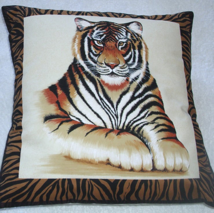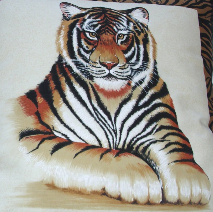 On Safari magnificent Tiger cushion , regal Tiger lying down. would look good in any lounge, sitting room, study or office on any settee or armchair or in a conservatory or summer house or on a bed.