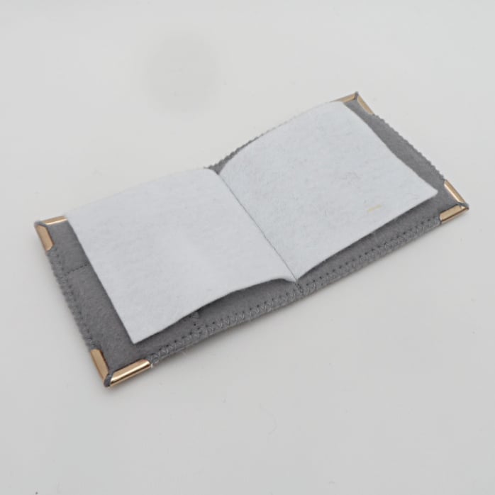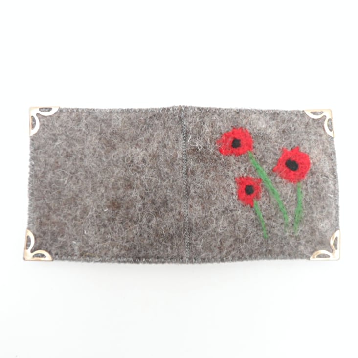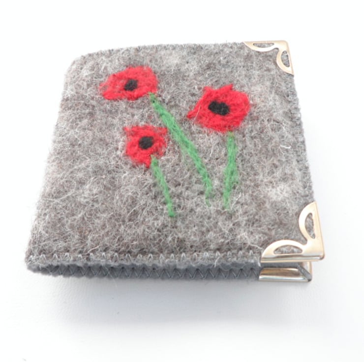 Natural grey Jacob wool has been wet felted to produce the outer cover of this needle case/sewing kit. Three red poppies have been needle felted onto the front surface as decoration. The needle case has been lined with plain grey felt and has two small pockets inside the front cover for storage of thread/buttons/needle threader etc. There are two white felt "pages" for storage of needles and pins. Gold coloured corner protectors have also been added.