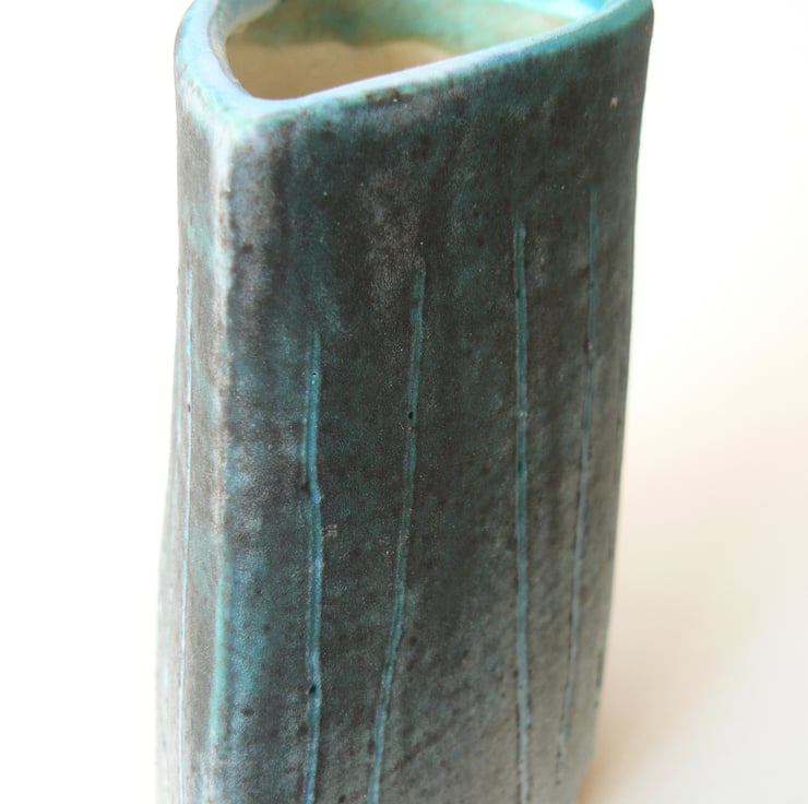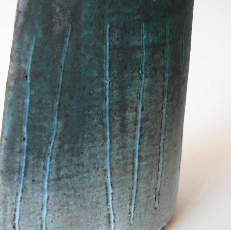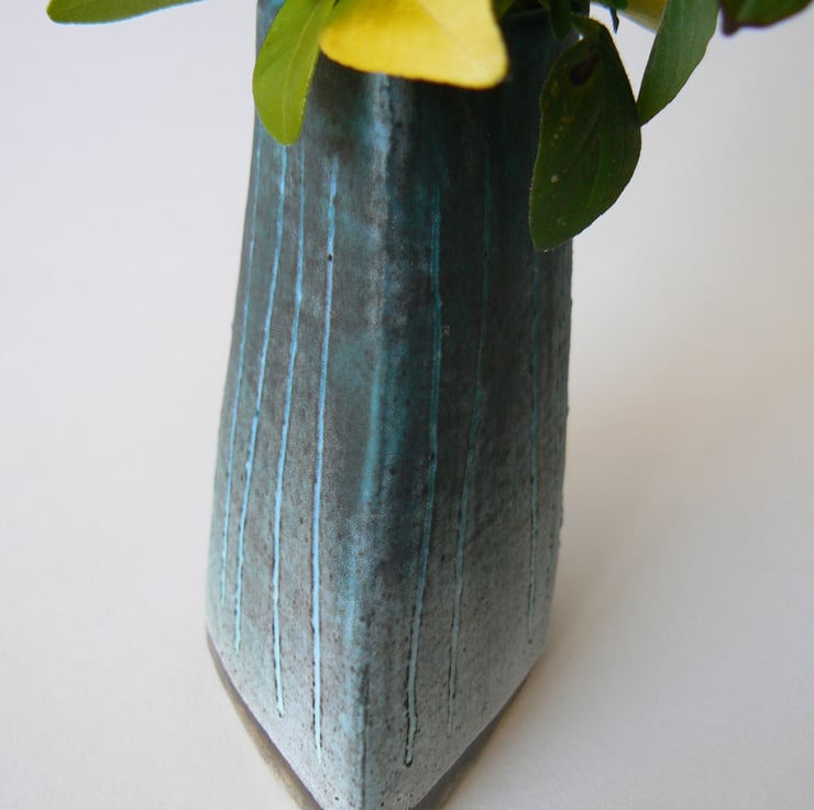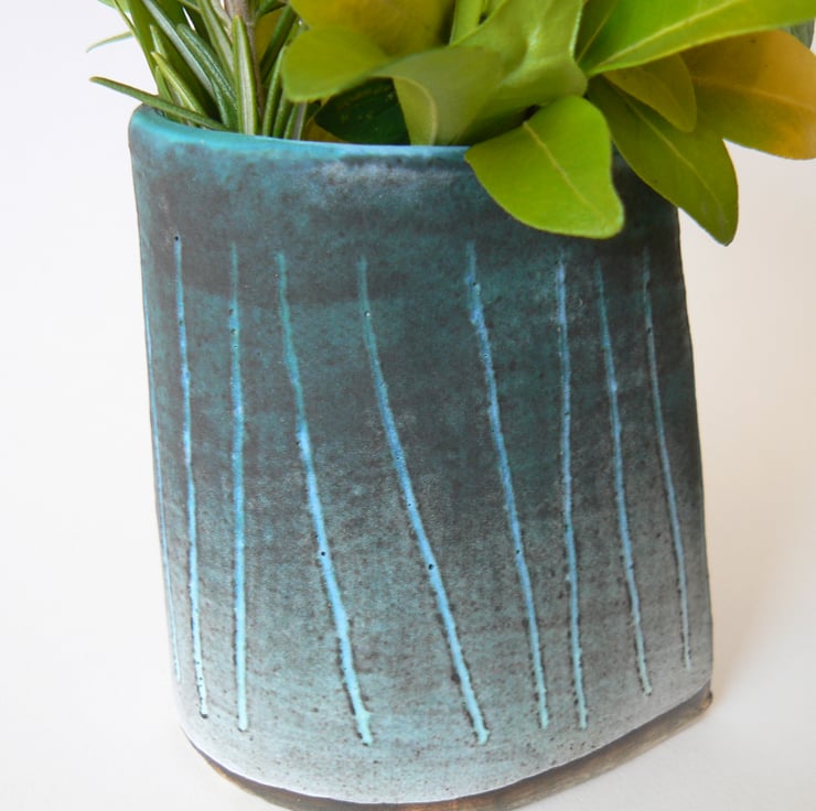 A small stoneware ceramic vase for flowers. I have used coloured slip on the piece before the first firing creating the pattern using sgraffito technique.