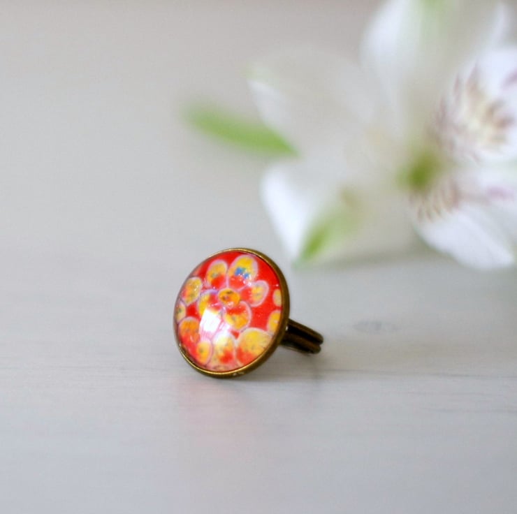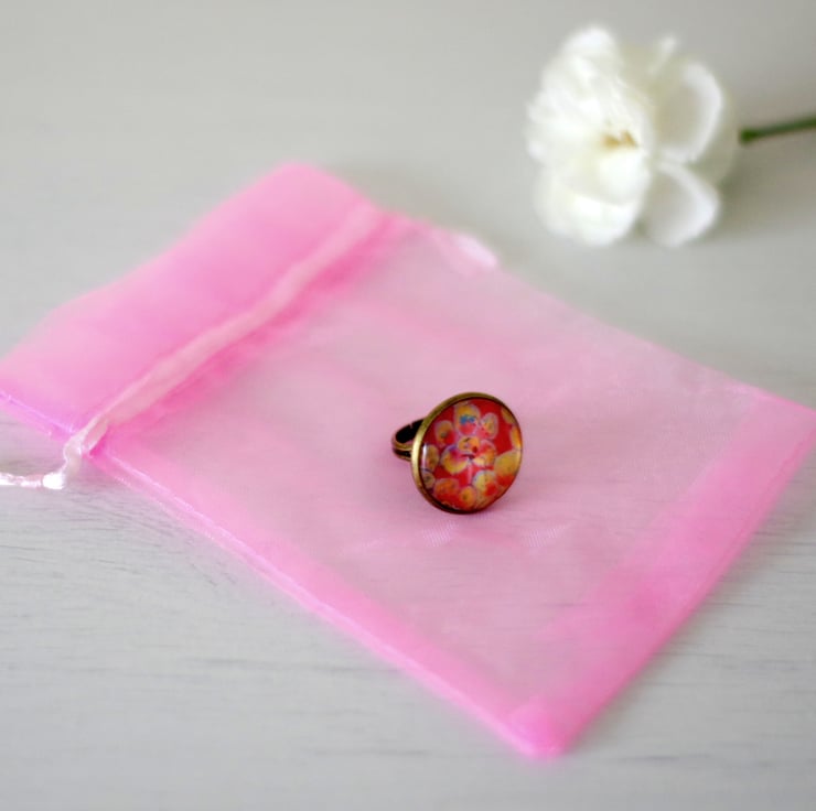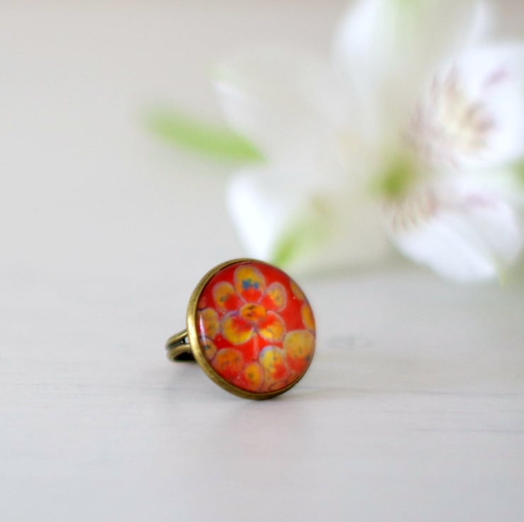 I made this ring using a mini print with red flowers after one of my original paintings. The image is printed at home on 270 satin paper and it is fixed under the glass cabochon with diamond glaze. The ring is adjustable to fit all sizes and the cabochon is 20mm. The floral ring will be wrapped in tissue paper and placed in an organza bag. I will send the ring in a padded envelope.