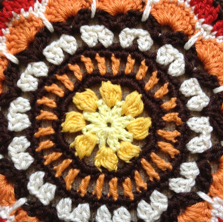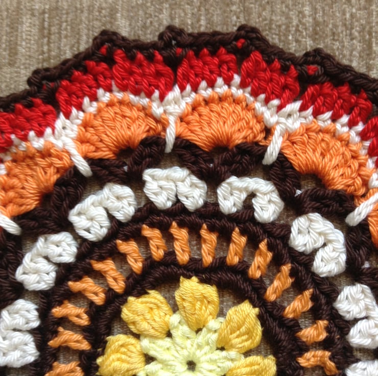 This Autumn Mandala has been crocheted in red,brown,orange,yellow and cream.