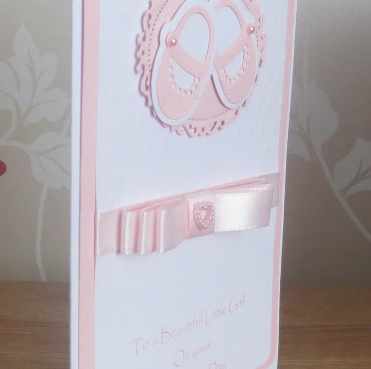 designed with an multi layered embossed spotty background, completed with tiny shoes with faux pearl buttons on the straps placed on a decorative lace edge die cut base and finished with Satin ribbon and bow and a pearl heart to complete the design
