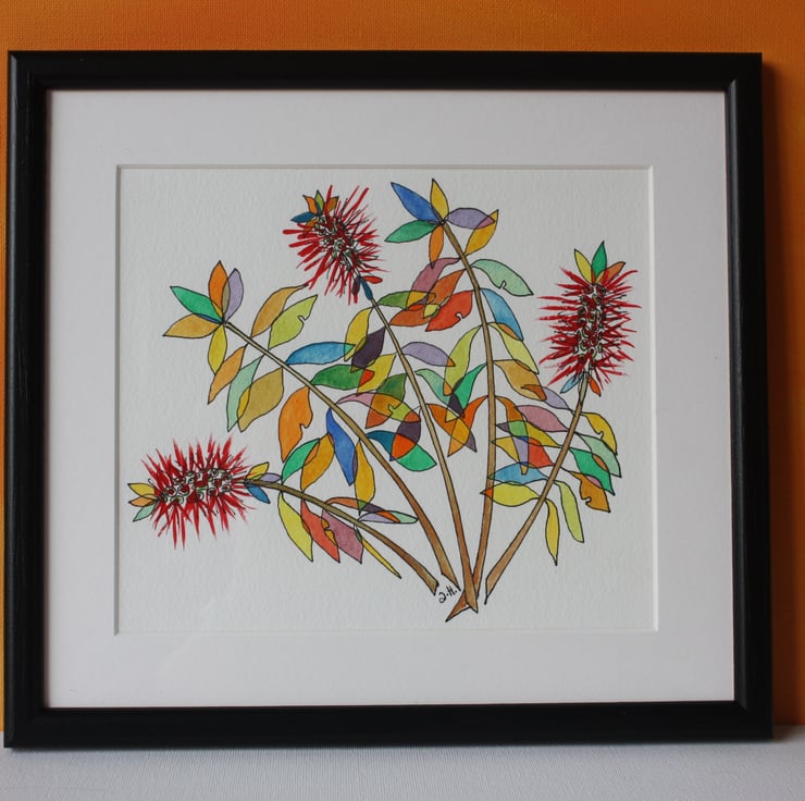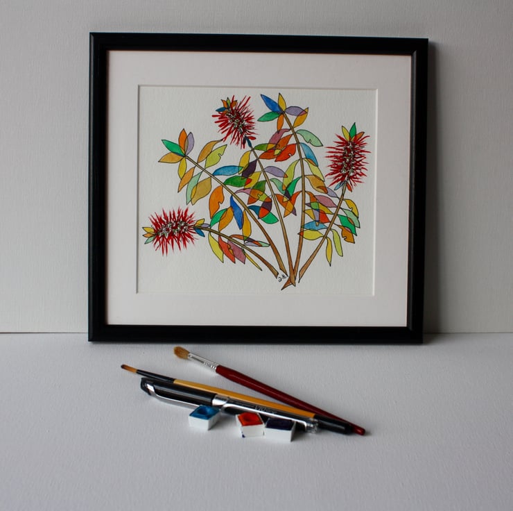 This quirky picture of Bottlebrush flowers is a pen and watercolour sketch that I made in Crete. It is painted on high quality watercolour paper and finished off with a white mount, black frame and plexiglass which reduces reflection. The frame measures 25 cm x 27.5 cm.