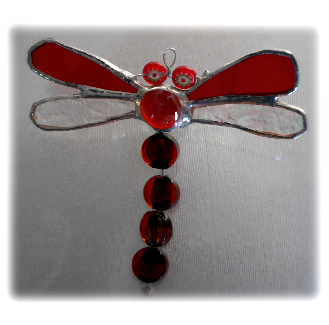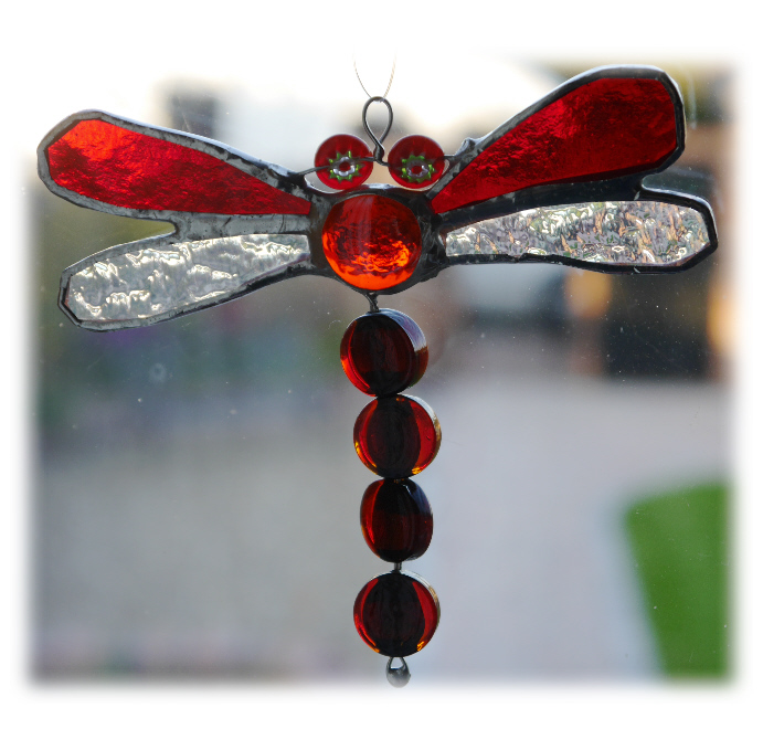 It looks really lovely hanging in the window where it catches the light. The suncatcher hangs from a strong nylon thread which is securely attached to the top of the dragonfly. It is 4inches wide and high.