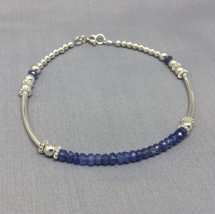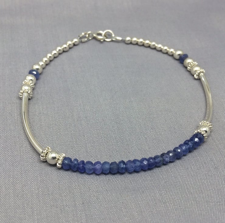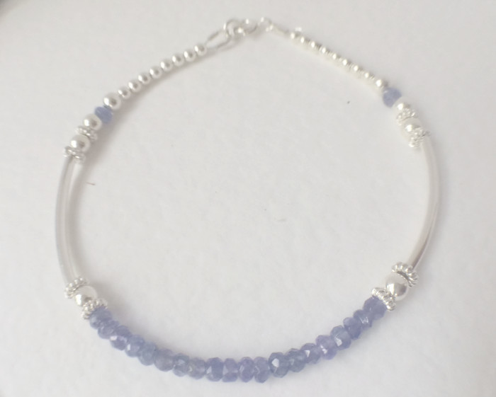 Lilac Tanzanite Sterling Silver Noodle Ball Bangle Bracelet. I made this bracelet with 3 - 4mm faceted Tanzanite gemstones and 925 Sterling Silver beads and long curved tubes to create this bracelet. I finished by attaching a Sterling Silver bolt ring clasp.