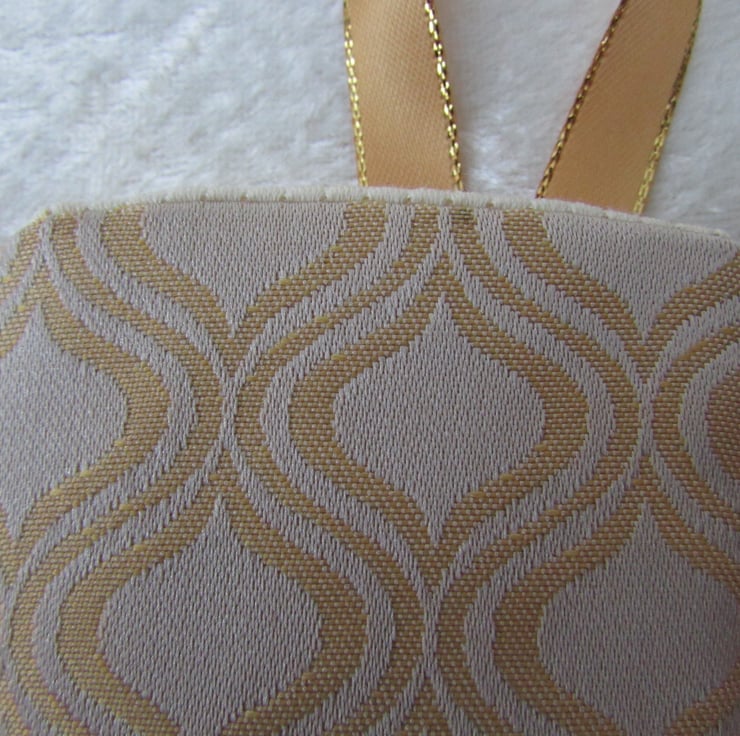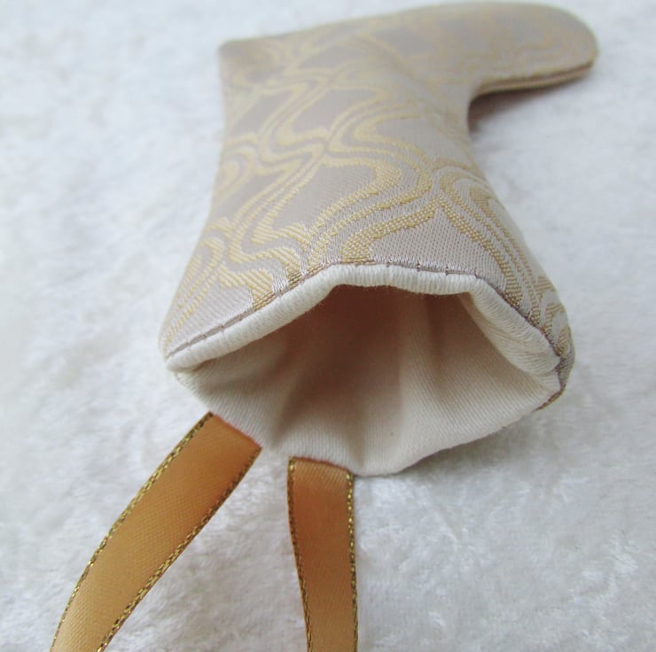 A small Christmas stocking made from a lovely fabric with a cream and gold abstract pattern. Fully lined with cream fabric. Gold hanging ribbon with sparkle edging. Size approx. 6" (15cm) high (excluding ribbon) x 4" (10cm) wide.