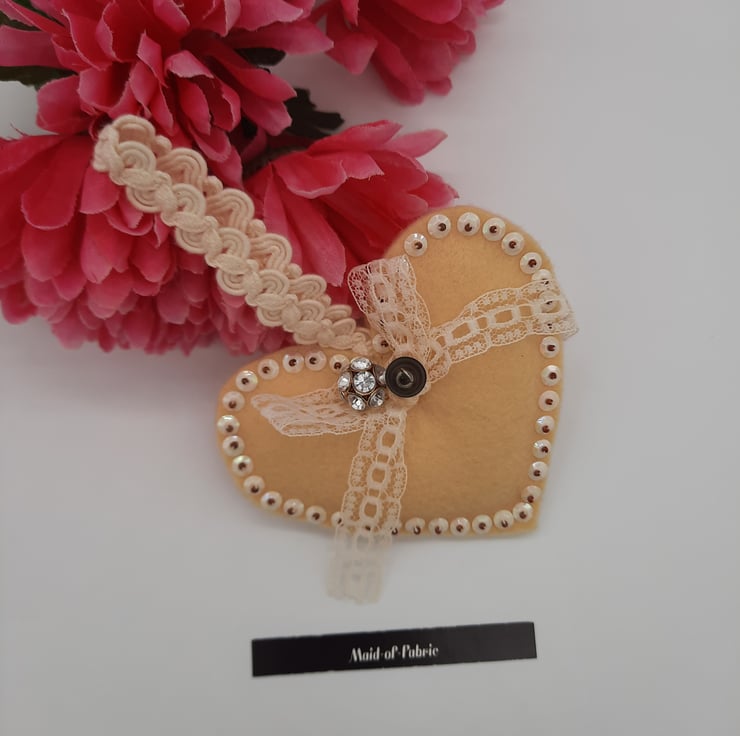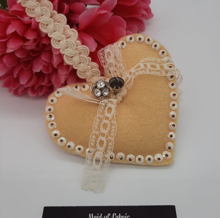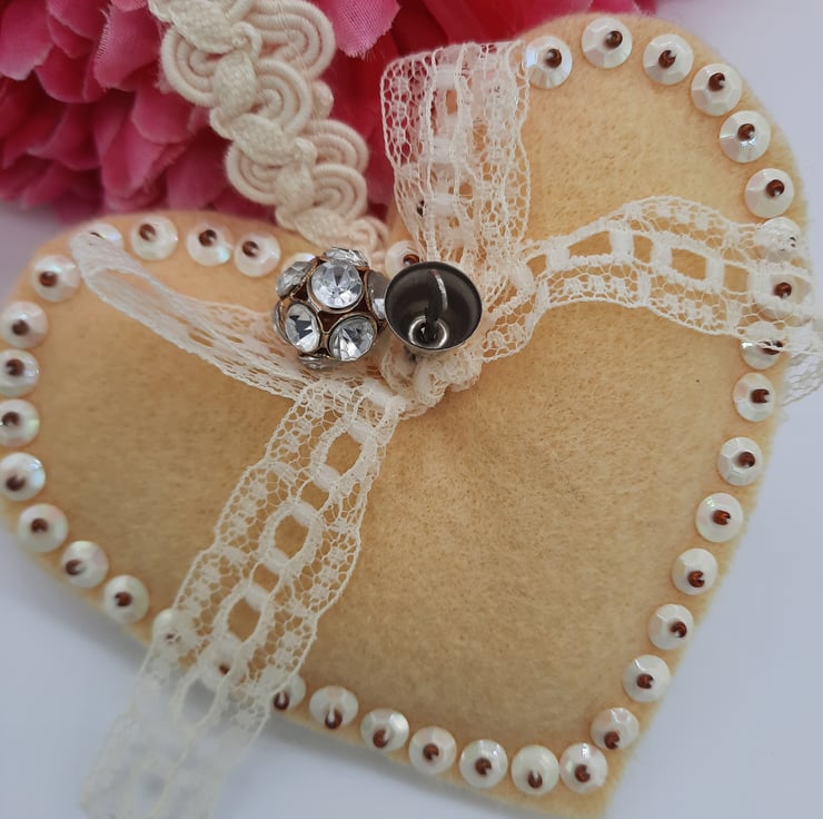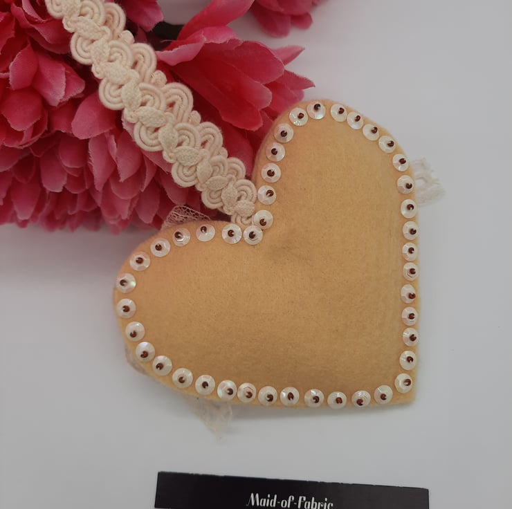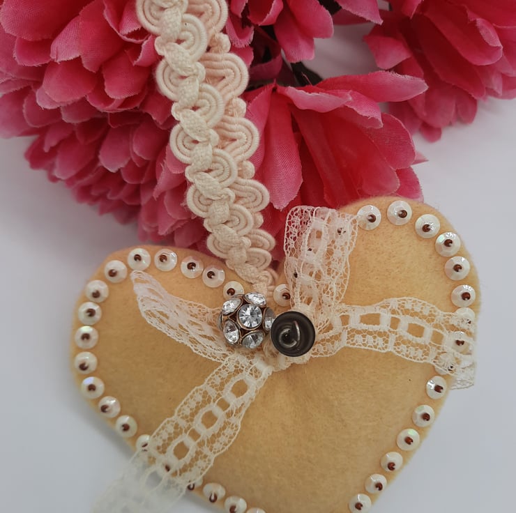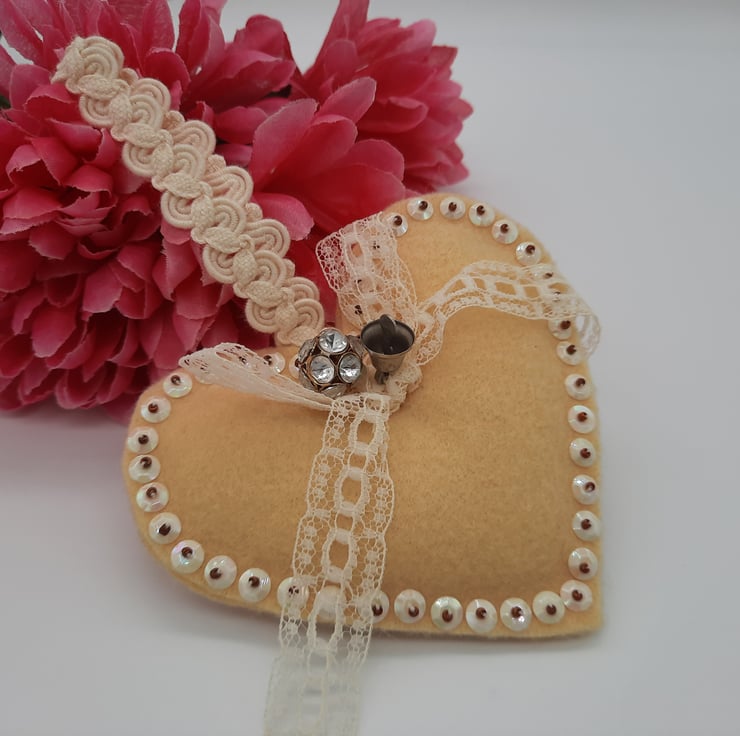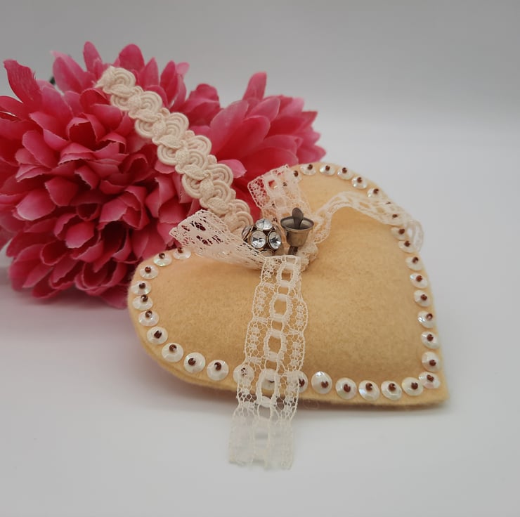 Cream heart felt hanger. Hand beaded and sequin edging.