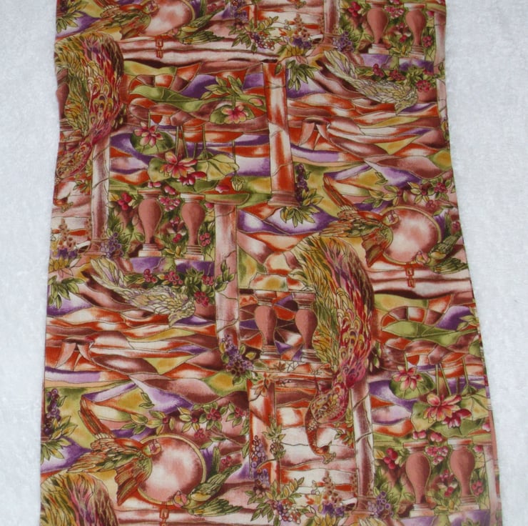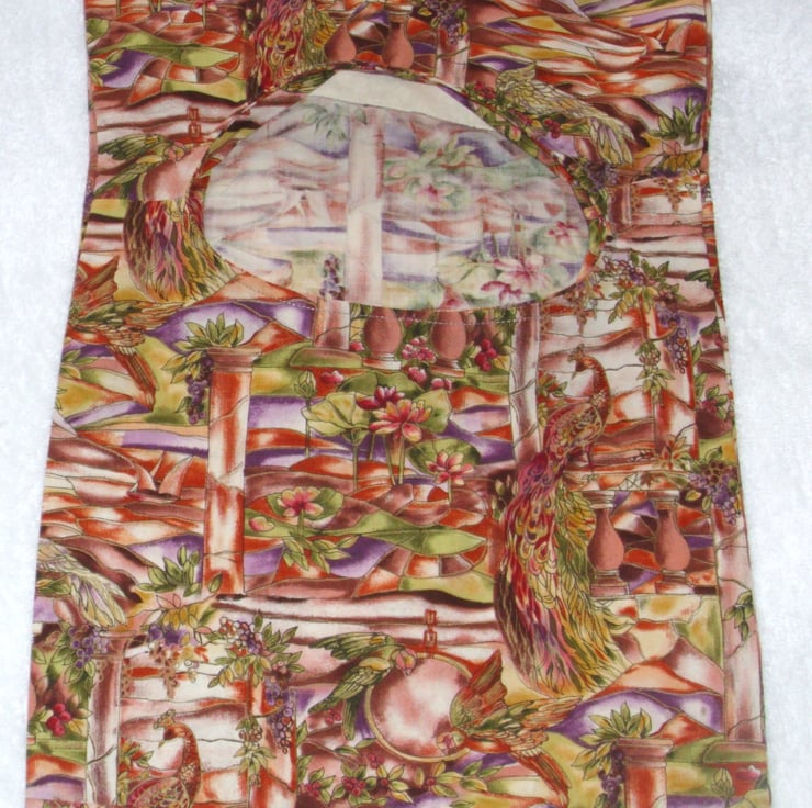 A fabric peg bag with hanger, Exotic birds among elaborate pillars and bright coloured plants very interesting pattern. upside down on back.