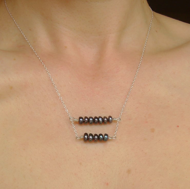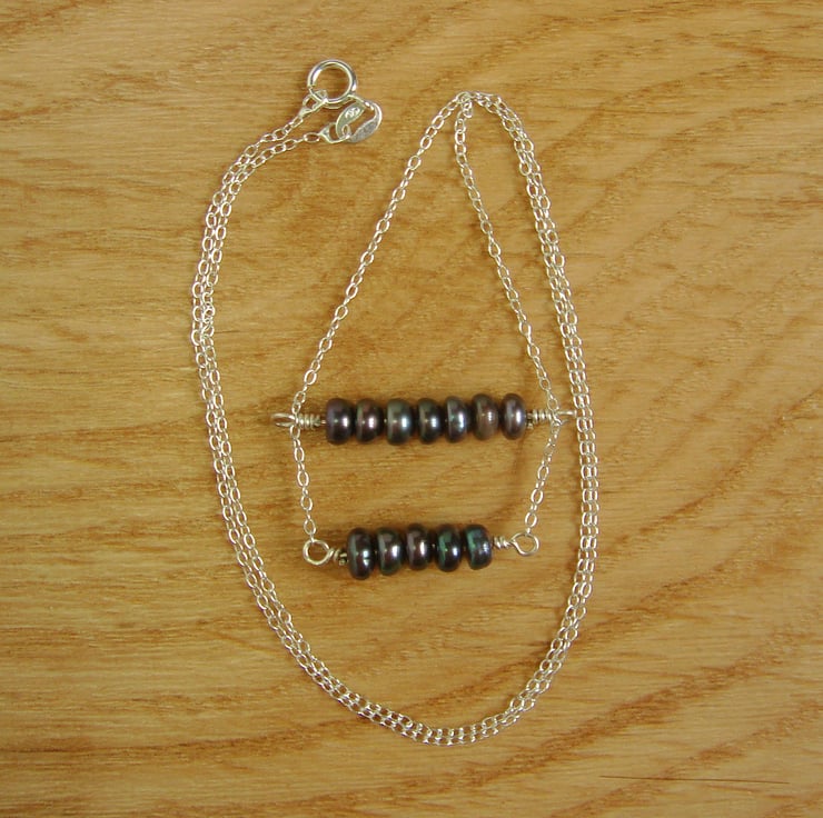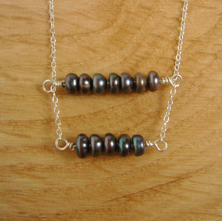 This is a fashionable double bar necklace with a twist. Instead of two plain metal bars, I have strung each with mysterious, dark peacock pearls, so called because they shine green and purple in the light. There are five pearls on the bottom rung and seven on the top on and all are mounted on a sterling silver chain measuring 17" or 430 mm in length and fastened with a bolt ring clasp. The pearls are cultured freshwater pearls that come from farmed mussels.