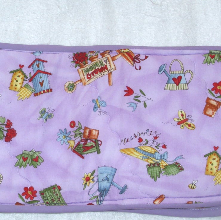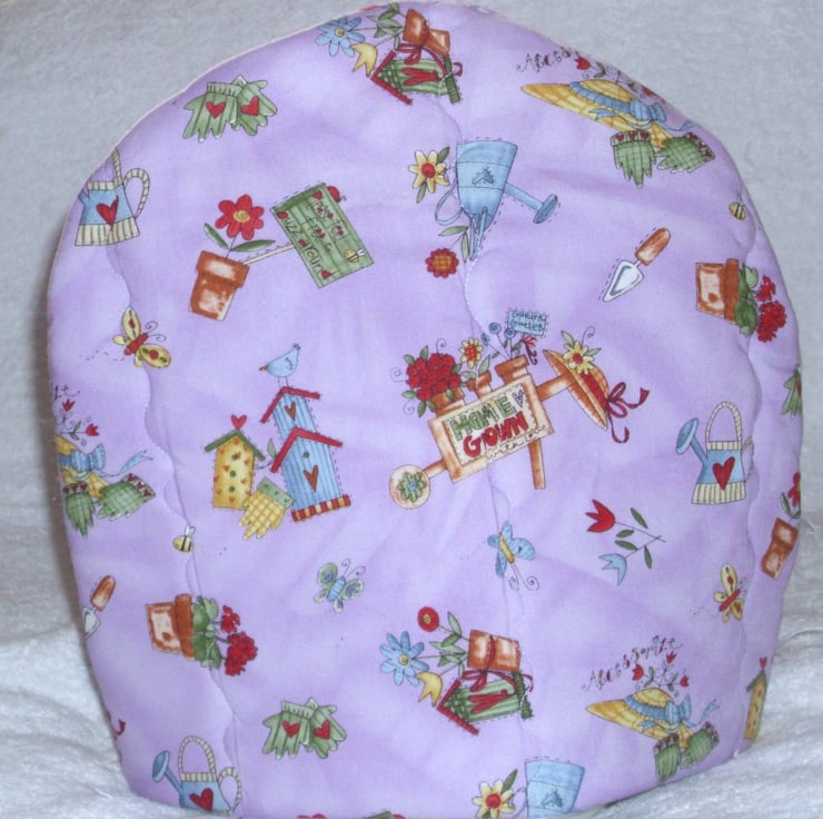 In the Garden tea cosy and oven gloves with pretty flowers in pots, birds on blue bird houses, butterflies, gardening gloves and pretty hats, garden trowels and watering cans on a pretty lilac background .Size 26.5 cm wide 26 cm high . will keep tea hot upto half an hour after you make it , fully washable