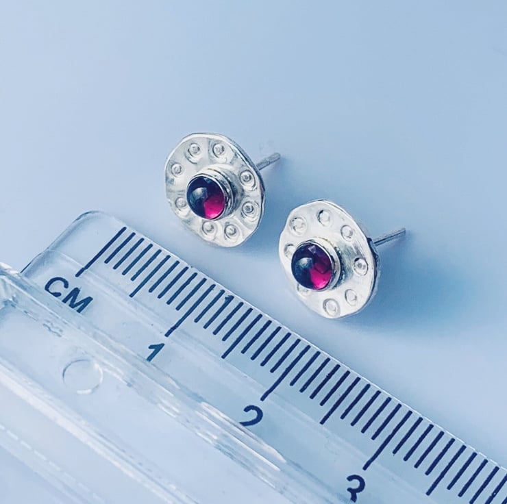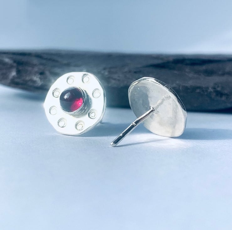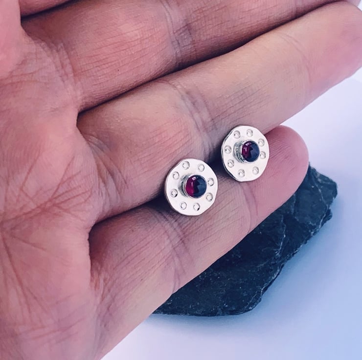 Recycled Sterling Silver Garnet Textured Disc Stud Earrings