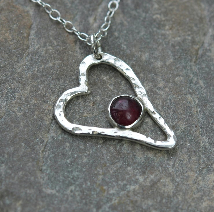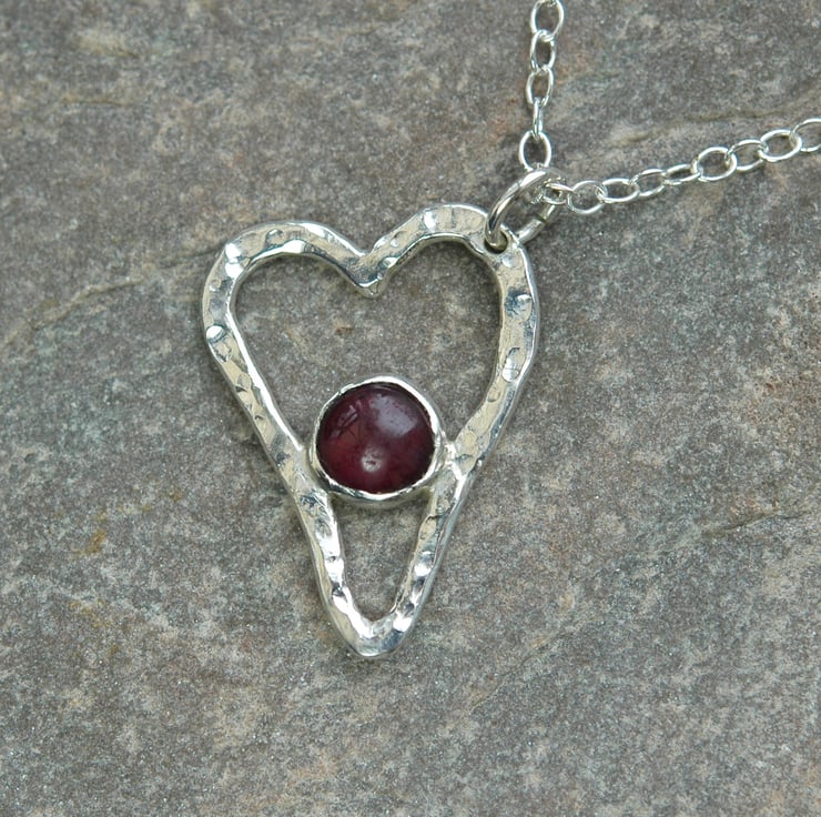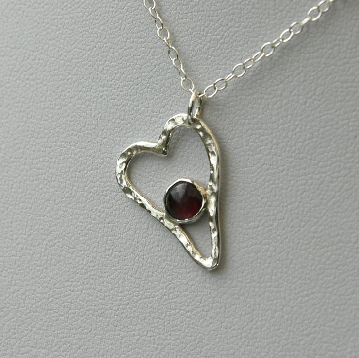 A lovely romantic gift for Christmas, birthday or Valentines Day! This pretty little heart pendant is made from sterling silver wire which has been beaten with a ball-pein hammer to make it sparkle in the light. I have inserted a 6mm round garnet gemstone mounted in a sterling silver bezel cup. Garnet is a January birthstone. The pendant measures 2.4x1.6cm and is attached by means of a jump ring to a 45cm (18in) sterling silver trace chain. It has been hallmarked on the back by the London Assay Office.