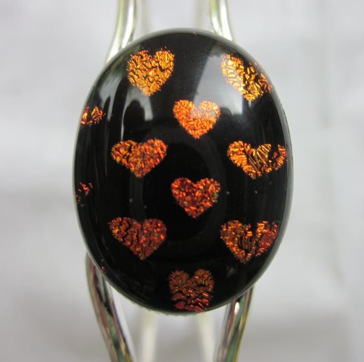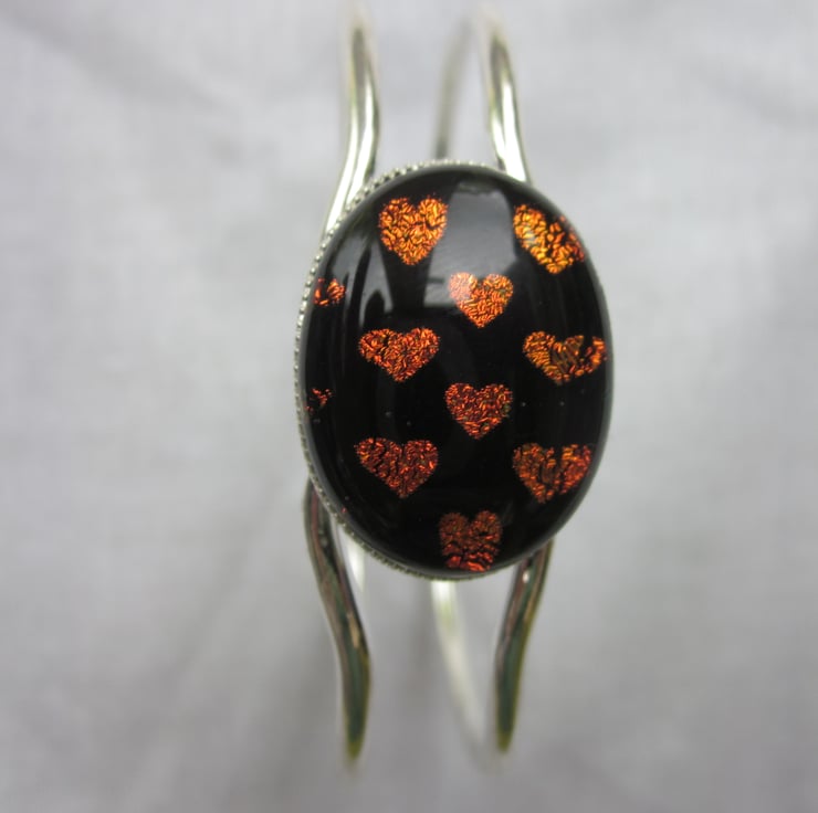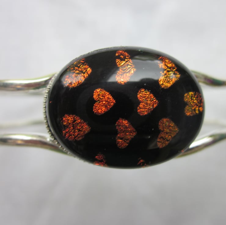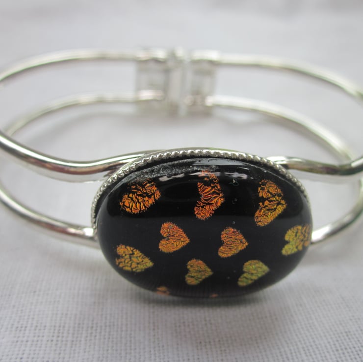 This cabochon is a beautiful dichroic shimmer in burnt orange in a repeated heart design with a black base. The beautiful dichroic is very difficult to photograph! This is set within a cabochon setting on a good quality silver plated spring bangle which has a circumference of 7 1/4 inches. The spring allows the bangle to fully open for ease of use.