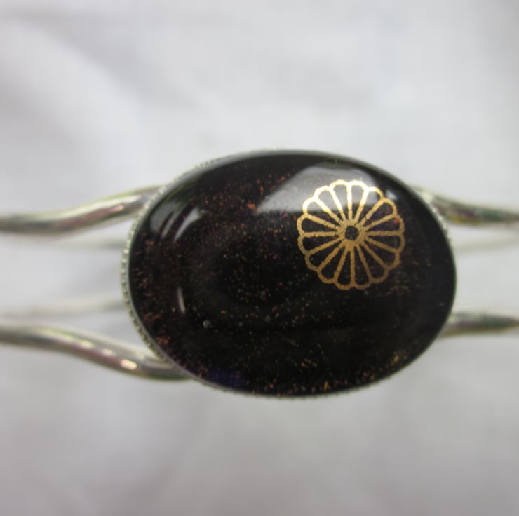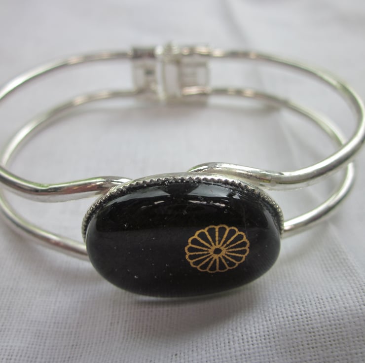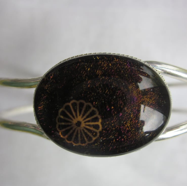 This cabochon is a beautiful dichroic shimmer in chocolate on a transparent purple base - quite subtle and beautiful. The beautiful dichroic is very difficult to photograph! On the surface is a 22 carat gold daisy. Please note that this is not a sticker but a real gold glass decal.This is set within a cabochon setting on a good quality silver plated spring bangle which has a circumference of 7 1/4 inches. The spring allows the bangle to fully open for ease of use.