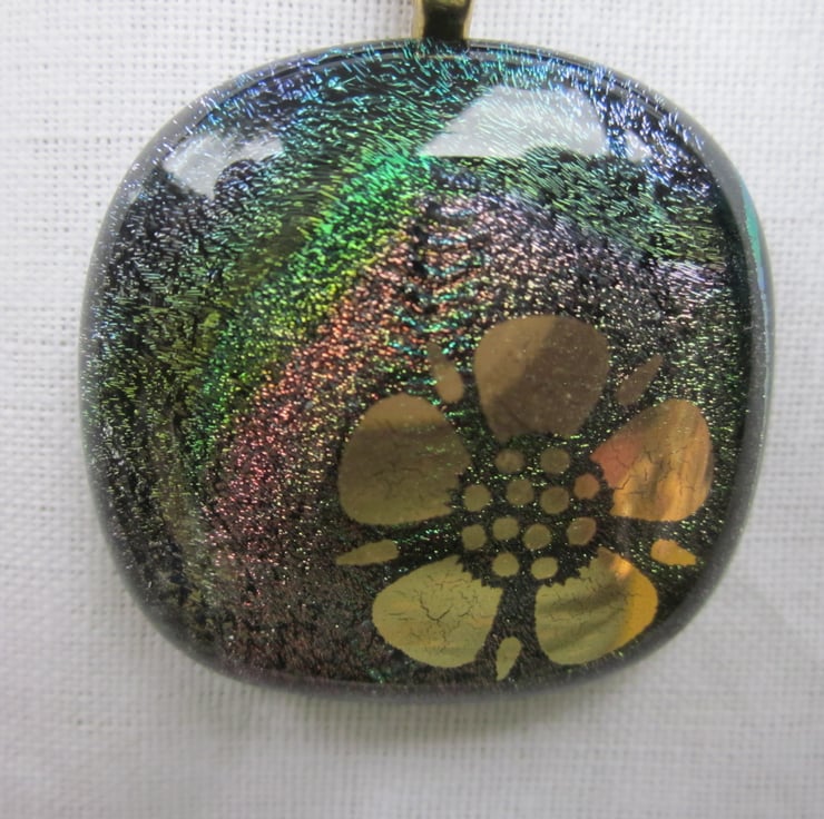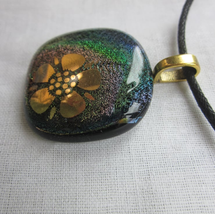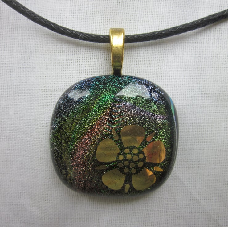 This glass cabochon was fused by me. It has a beautiful subtle dichroic shimmer of antique rose, green, purple and teal on a black glass base. It is approximately 1 1/4 inch high. It is far more beautiful than in the photograph - it is impossible to do justice to this glass. On the surface is a 22 carat gold Tudor Rose. Please note that this is not a sticker but a real gold glass decal. This pendant has a gold coloured metal bail. This will come with a free cord necklace.
