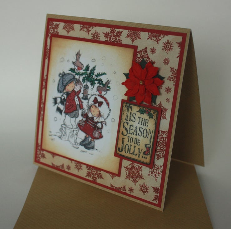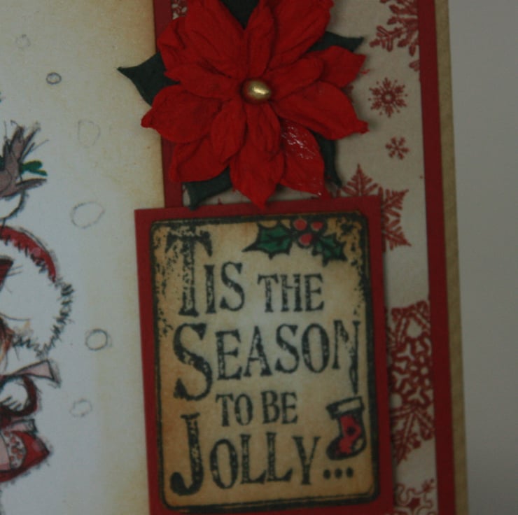 The message 'Tis the season to be jolly' has been stamped, coloured and aged using the same distress inks. A paper poinsettia embellishment finishes the card.