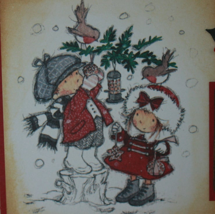 Square kraft Christmas card featuring an image of a couple feeding Christmas robins. The image has been aged using distress inks and layered onto pretty cream and red snowflake backing paper.