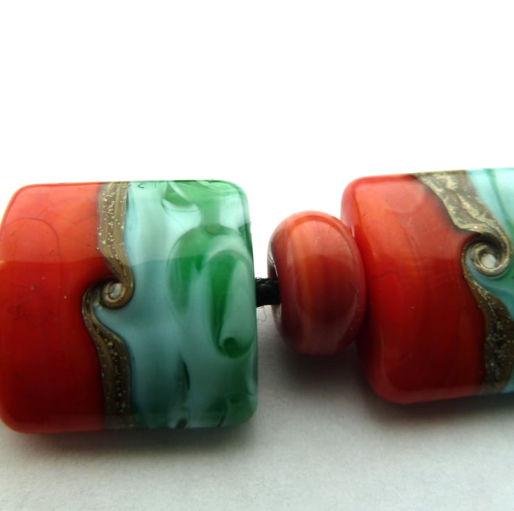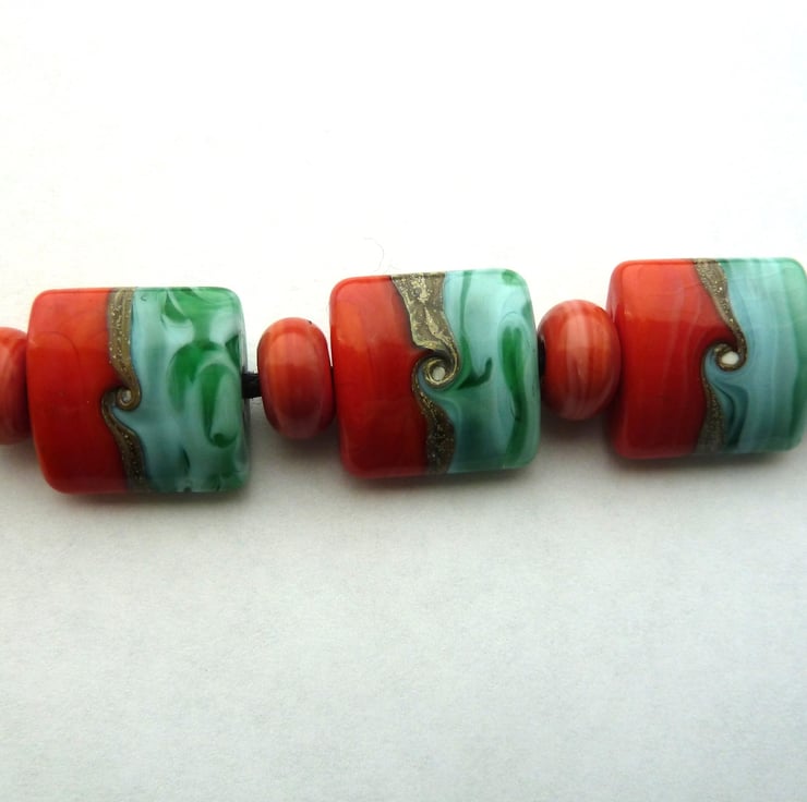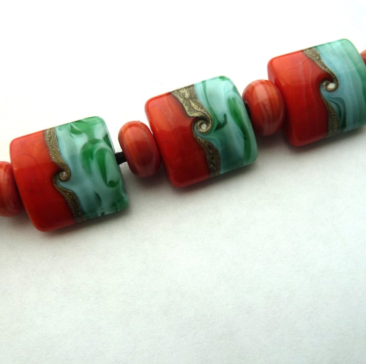 A set of 7 handmade lampwork glass beads which feature 3 pillow beads and 4 spacers. The pillow beads have been made with green and coral glass, wrapped with silvered ivory stringer and shaped using a brass press. The spacers have been made with coral glass.