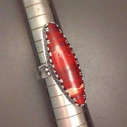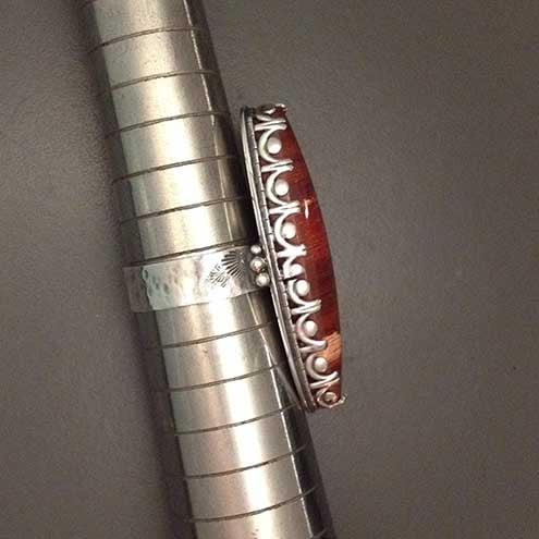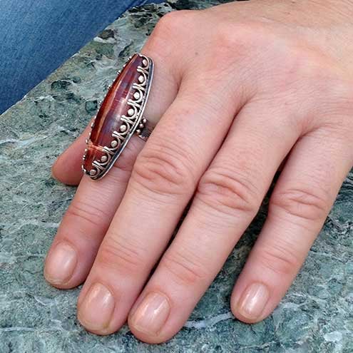 The stone is 45mm long and 15mm at the widest point. This ring is NOT adjustable but has a solid wide band of silver which has been stamped then oxidised to enhance the patterns. The shoulders of the ring band are decorated with silver ball granulation.