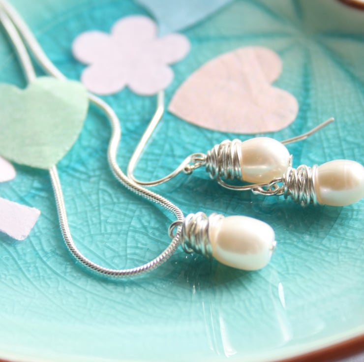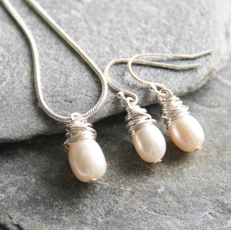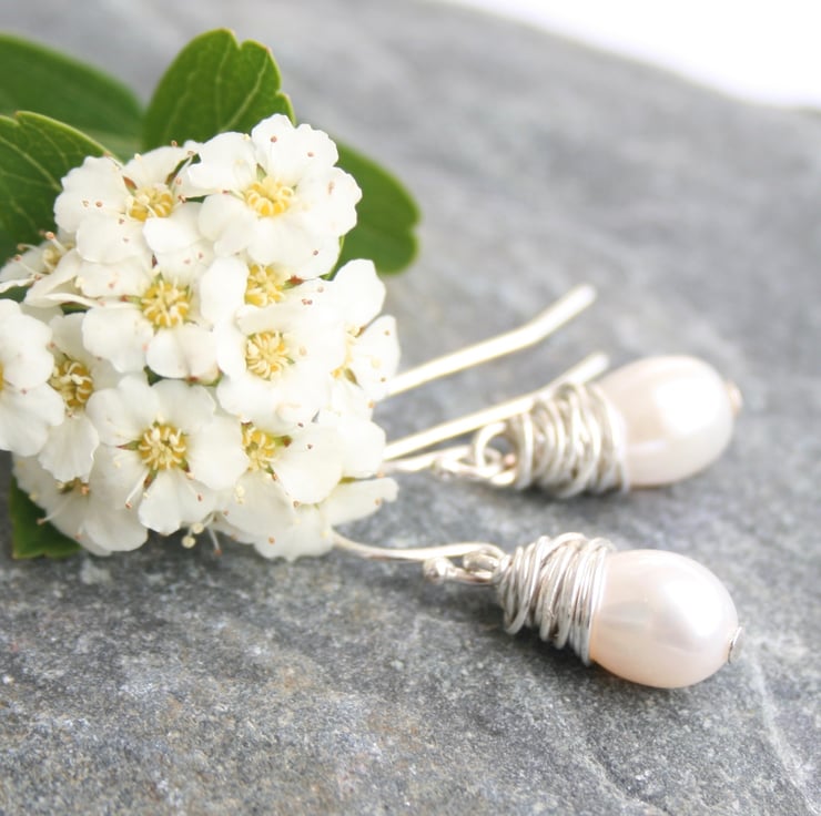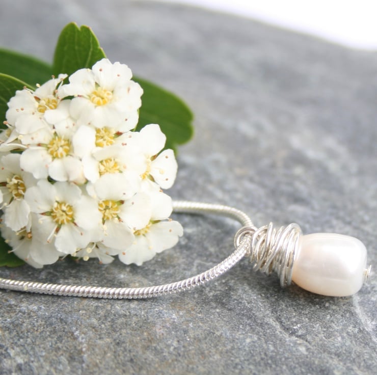 The freshwater Baroque pearls have been wire wrapped with sterling silver wire and hang from either a sterling silver snake chain or sterling silver ear wires. The silver chain comes in 3 lengths: 16, 18 and 20 inches. This can be selected from the menus.
