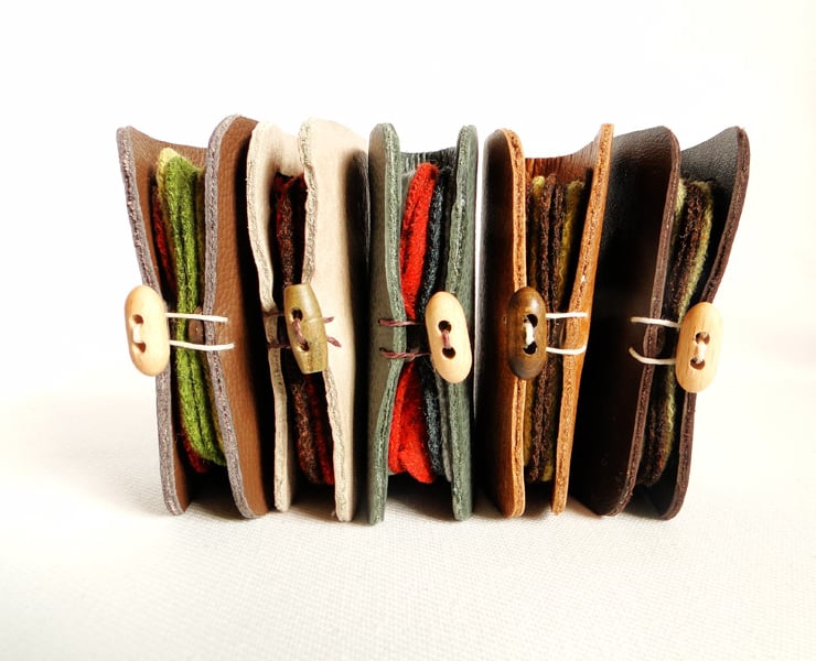 Keep them together in this cream leather case, measuring 9cm x 7cm with a red fox fabric interior and six separate 'pages' for needle storage in burnt orange and dark brown felt. Fastened with a toggle button.