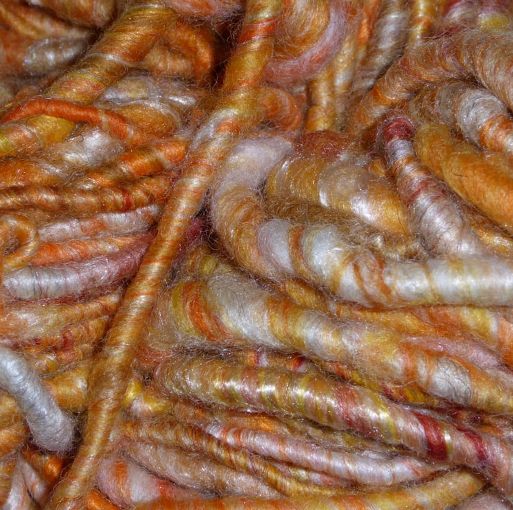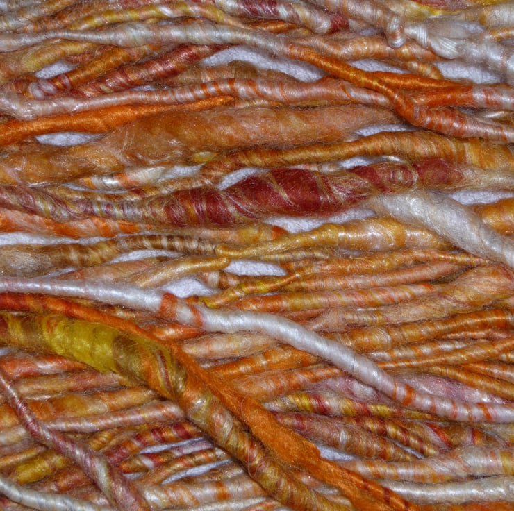 I have created this fantastic art yarn from a blend of orange, yellow and cream merino fleece. It is spun using the core spinning technique over a cotton core.