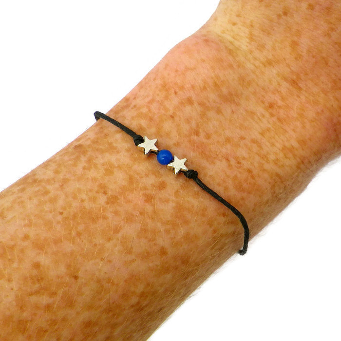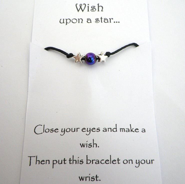 Hand made with black waxed cotton chord and silver star beads, often with a coloured centre bead. Beautifully presented on a card explaining how to make your wish. The chord is approximately 28cm long to make it easy to tie on. Just tie as loose or tight as you are comfortable with.