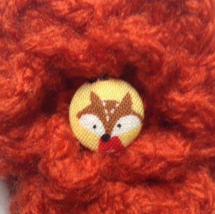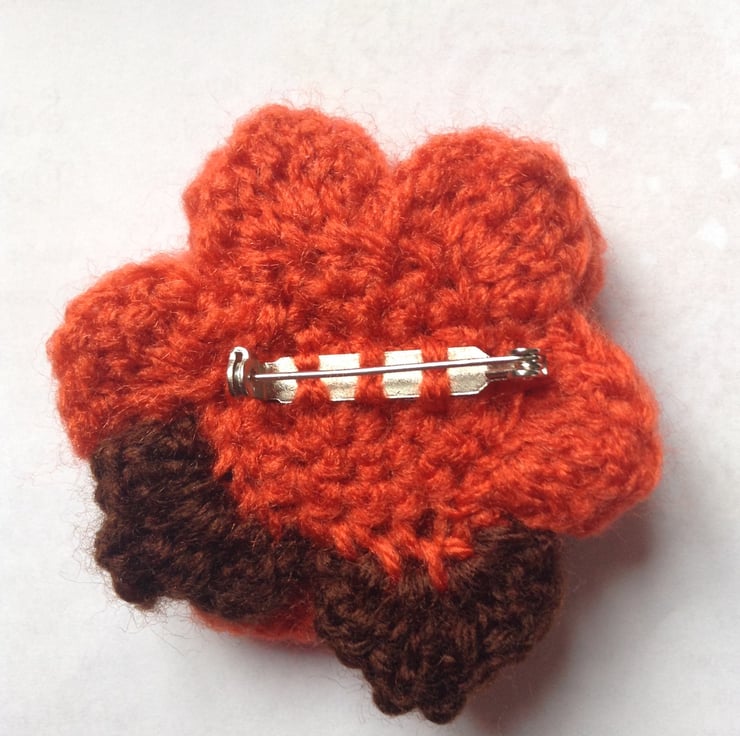 There are 3 layers of petals in burnt orange and 2 brown leaves finished in the centre with a cute fabric foxy button.