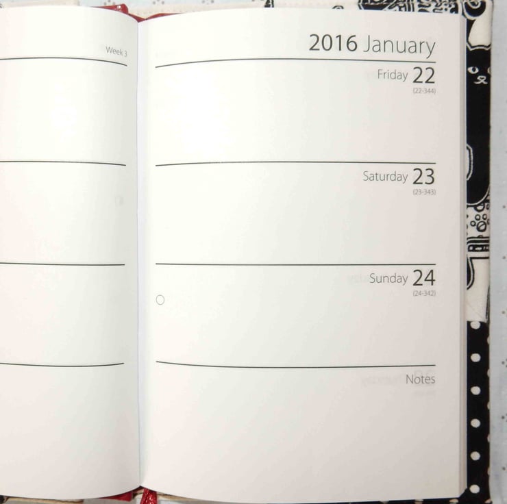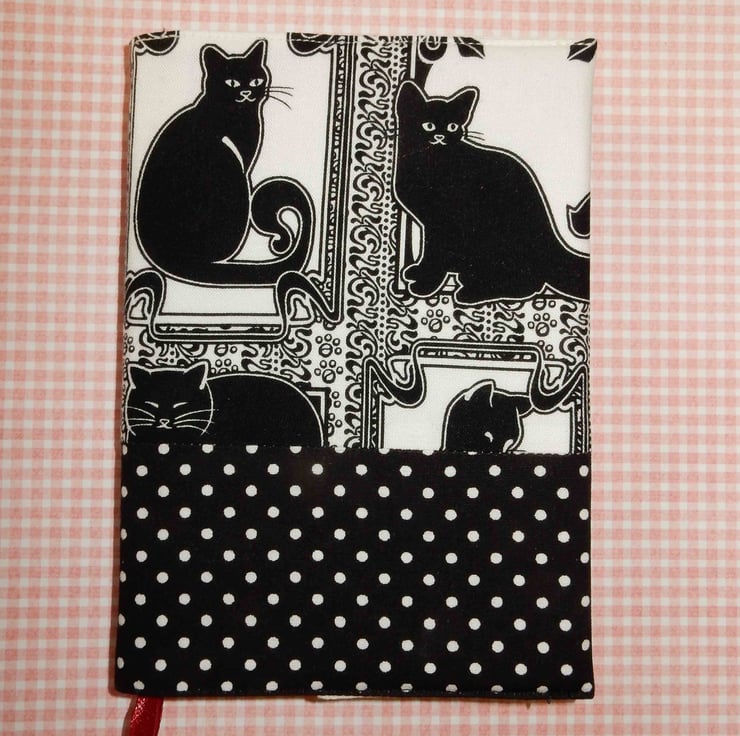 This is for cat lovers, a fun A6 (approx. 6x4 inches) week to view fabric covered diary. It is covered in a fabric featuring black cats on a white background with a contrast black and white fabric on the lower part. Complete with standard week to view diary, refills are easily available, for the next year. The cover is lined, interfaced and removable.