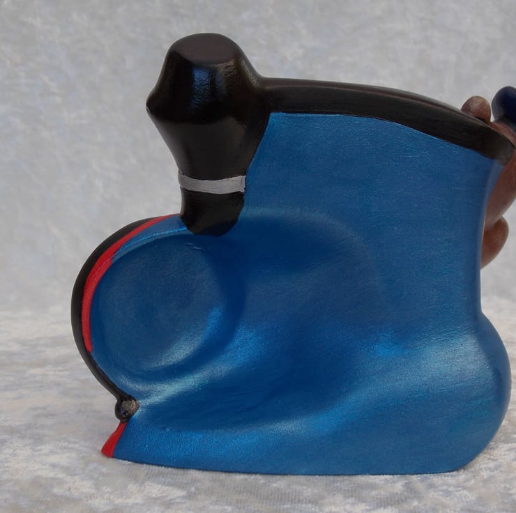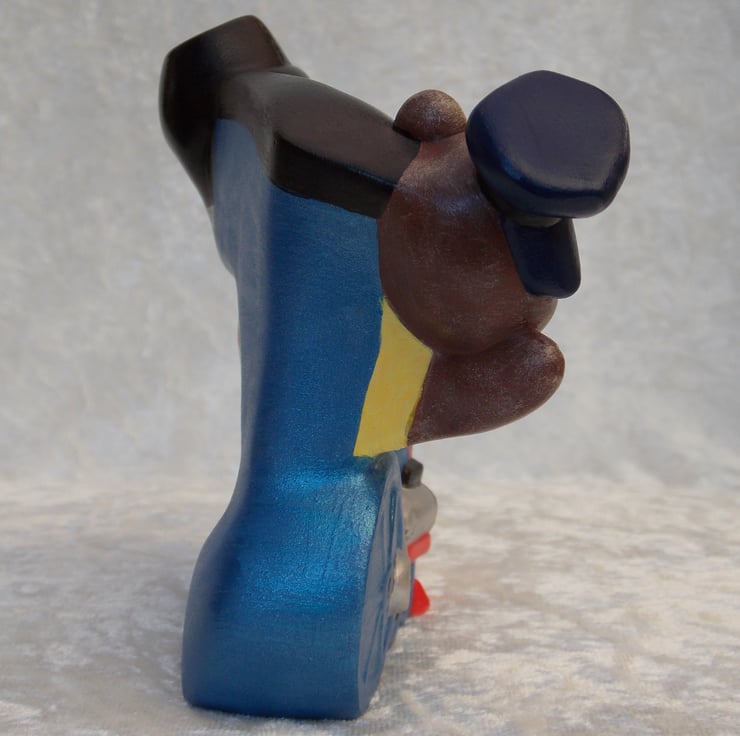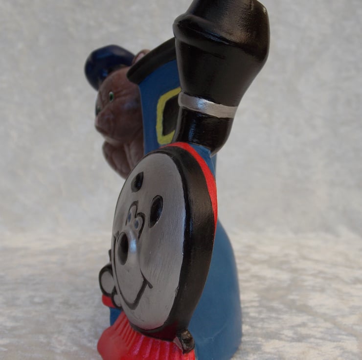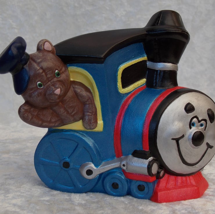 I have for sale a ceramic ornament, which was hand painted by myself. It is a brightly coloured train engine, with a teddy bear engine driver, hanging out of the window and waving. This would make a fun addition to any child's bedroom shelf, or perhaps given as a gift.
